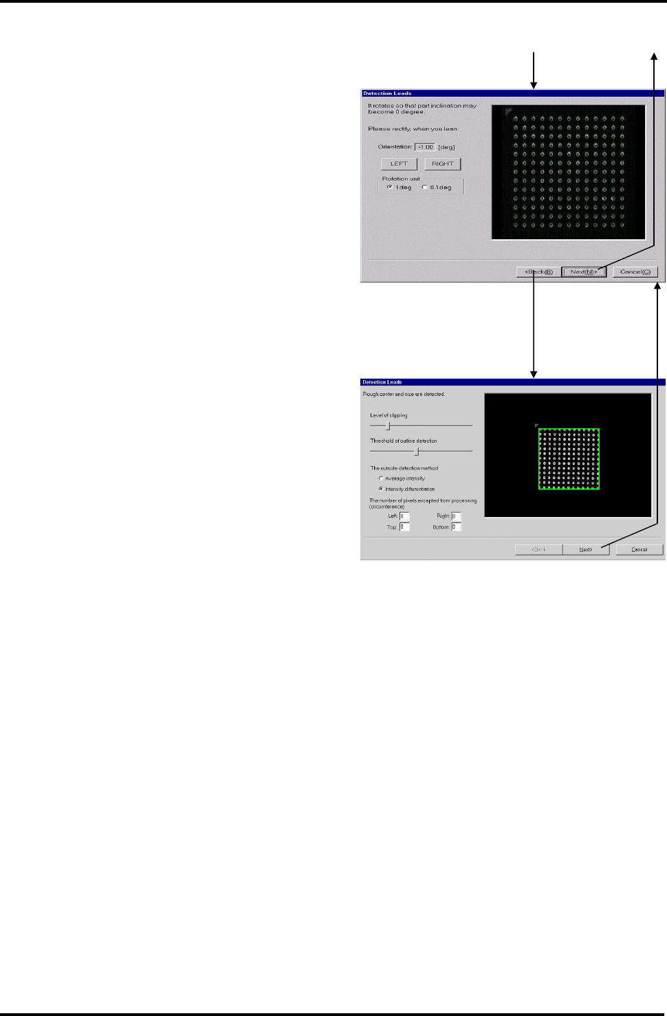 BM122 编程手册 8.8 创建元件数据 E34PCC-3F-0 90-B0 8.8-4 旋转可使元件倾斜变为 0 度 本属性页可以校正元件 的倾斜度。 左旋 : 反时针旋转图像。 右旋 : 顺时针旋转图像。 旋转单位 : 点击 <LEFT>( 左旋 ) 或 <RI GH T>( 右旋 ) , 确定旋 转的增量。 粗略检测中心和尺寸 本属性页允许调整表示 元件轮廓的绿 色框架。 剪辑级别 : 改变元件亮…