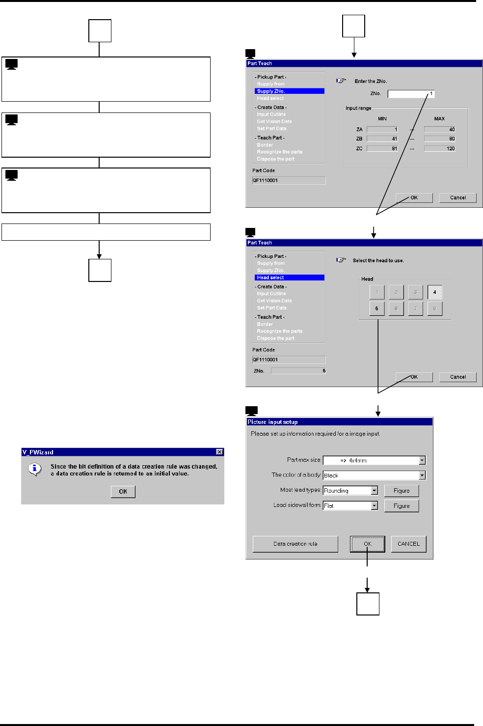 BM122 编程手册 8.8 创建元件数据 E34PCC-3F-0 90-B0 8.8-5 5. 6. : ‘Part Editor’ ( 元件编辑器 ) : ‘Sp eci fy p art code’ ( 指定元件 代码 ) 1. 2. 3. 4. 7. : ‘Part Editor’ ( 元件编辑器 ) 1 = 提示 = 1 : ‘Inst ruction for nozzle m ounting’‘ ( 吸嘴安装说明 ) 4 号…