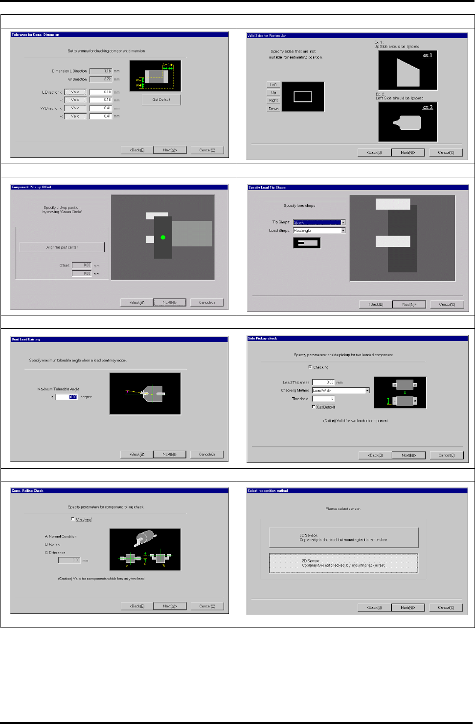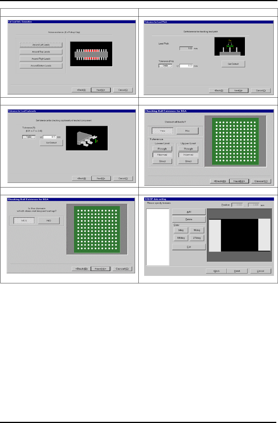 BM122 编程手册 8.8 创建元件数据 E34PCC-3F-0 90-B0 8.8-19 Q 设定切割导线的位置 R 设定导线跨距公差 S 设定导线共平面公差 T BGA 球存在检查的设定 U 设定非检查区域 V 设定亮度检查