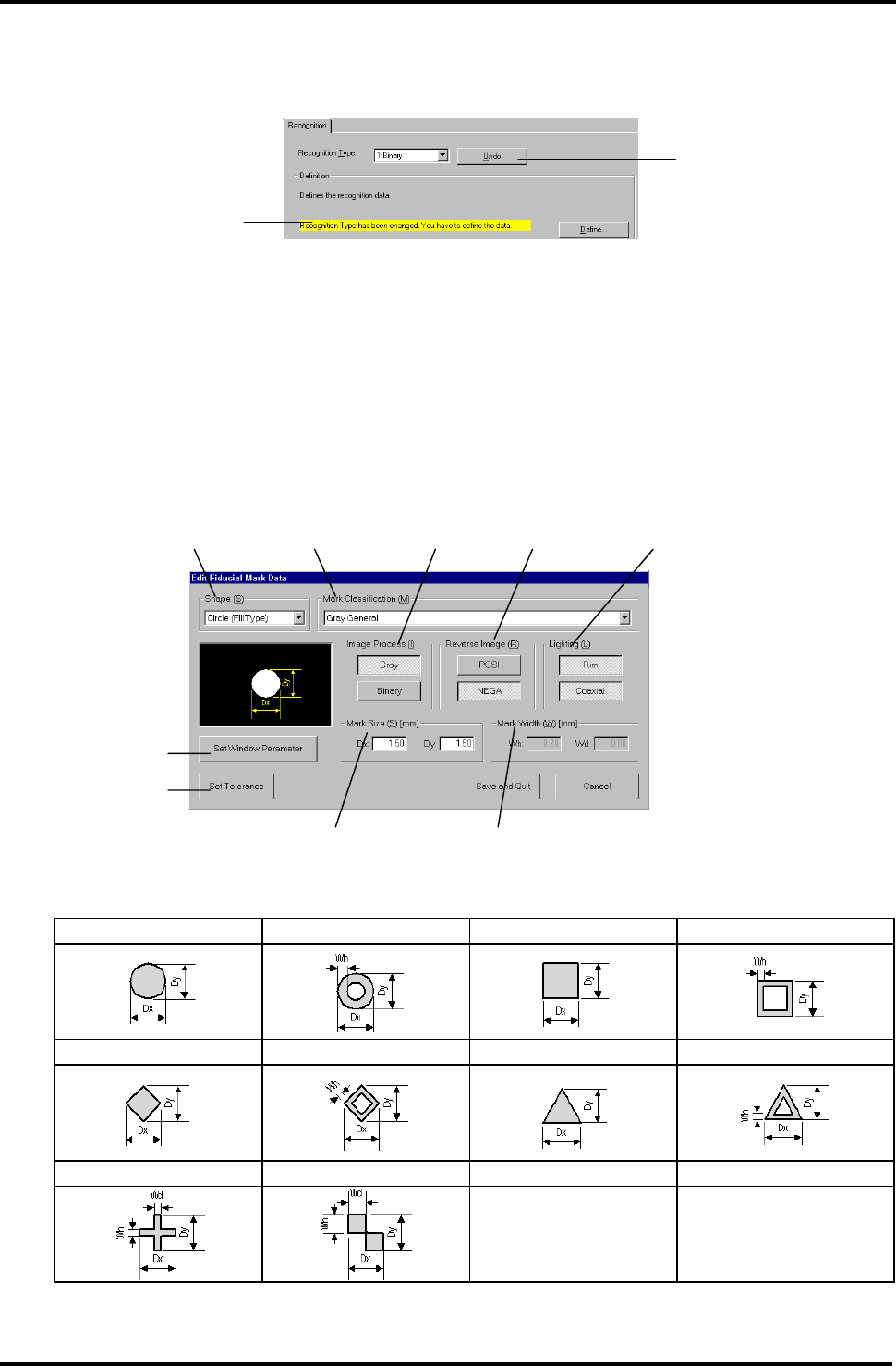 BM122 编程手册 3.1 标记程序库的设定项目 E34PCC-3 1-010-B0 3.1-2 识别类型 改变的情况下 : 1) 除非定义 了识别数据, 否则不能进行其他操 作。这样做 是为了避免数据的不一 致。 2) 将显示以 下的信息。 3) 可以用 < Undo> ( 撤销)按钮来恢复识别 的类型。 5. < 示教 > 允许识别标记的形状以 及新建识别数 据。 = = 请参考 “编程手册 / 数…