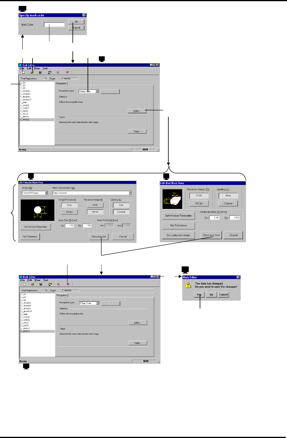 BM122 编程手册 3.2 标记程序库的创建 和编辑 E34PCC-3 1-020-B0 3.2-2 7. 1. 5. 2. 3. 6. 8. 10. 12. 11. 4. 9. : ‘ Specify mark c ode ’ ( 指定标记 代码 ) : ‘ Confi rmation of save ’ (确认保存) : ‘Mark Editor’ (标记编辑器) : ‘ Edit Fiducial Mark Data ’ ( 编…