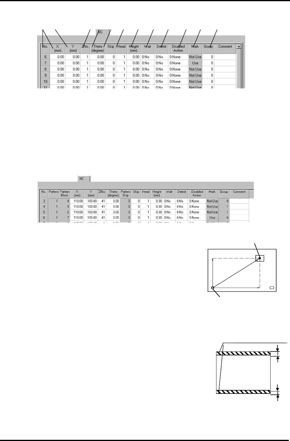 BM122 编程手册 6.3 NC 数据的设定项目 E3 4PCC- 3A-020 -B0 6.3-5 不允许元件存在的区域 。 3 mm 3 mm 元件贴装位置 PCB 原点 基板 元件 X (+) Y (+) 6.3.3 [NC] = 注意 = 扩展后的 数据 下列参数将被加入到 [N C] 选项中: 图形 : 指数据扩展前的图形。 图形程序块 : 显示图形中程序块编号 。 表示数据扩展前基准图 形中的程序块 编号。 跳…