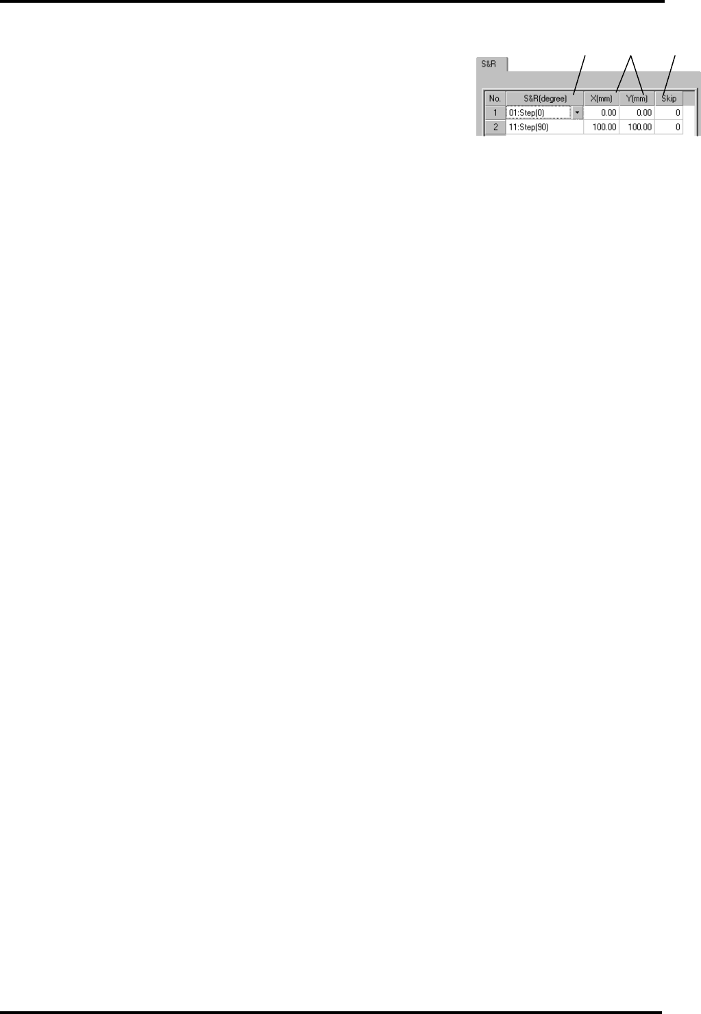 BM122 编程手册 6.3 NC 数据的设定项目 E3 4PCC- 3A-020 -B0 6.3-1 1 6.3.4 [S&R] = 提示 = 扩展数据后,将不会显 示 [S&R] 选项 . 3. 1. S&R ( θ ) 在将要进行贴装的基板 上有一些相同 的贴装图形时, 使用 S&R 指定 步骤重复或图形重复。 01: 步骤 (0 ° ) 02: 图形 (0 ° ) 11: 步骤 (90 ° ) 1…