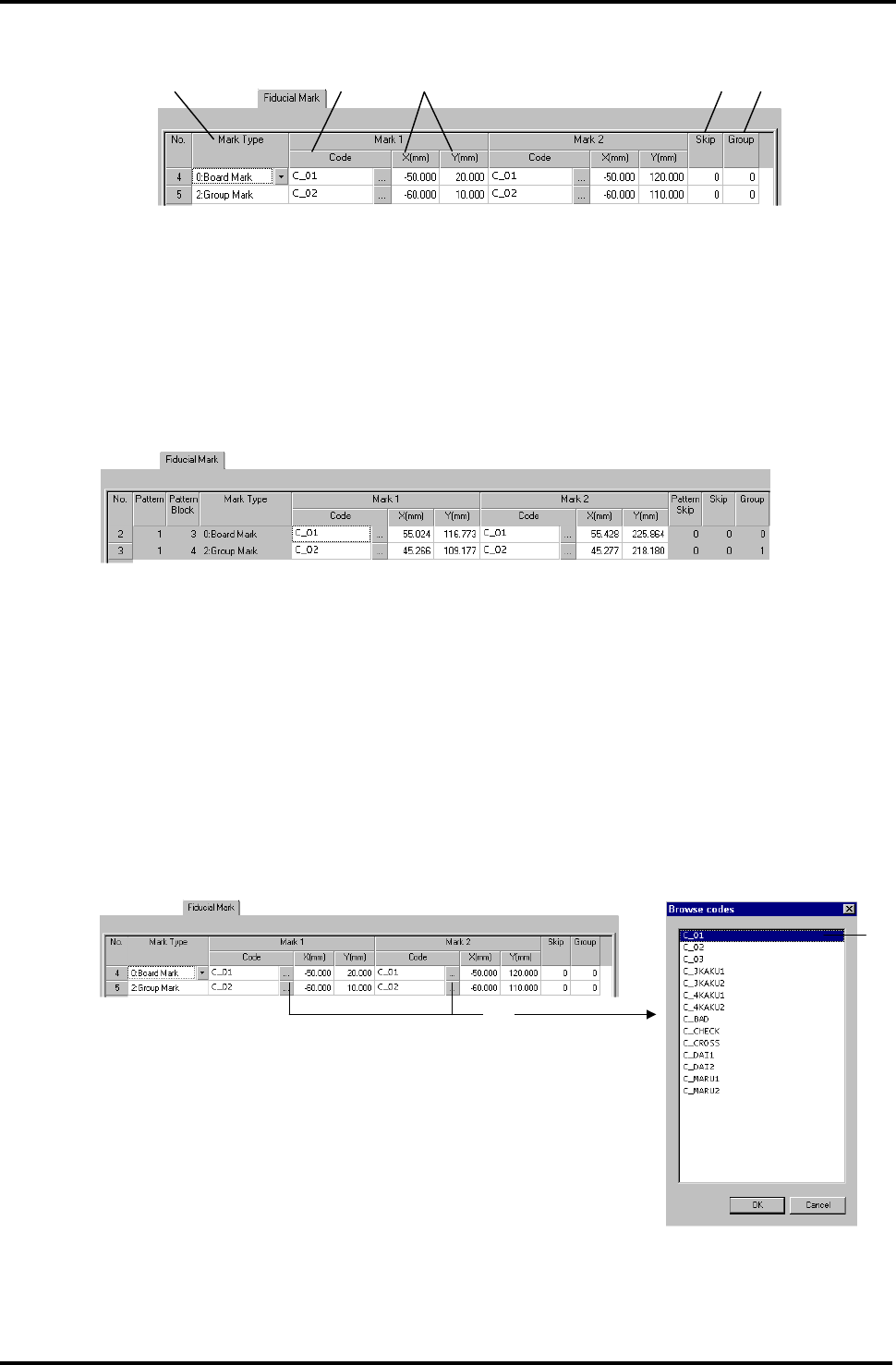 BM122 编程手册 6.3 NC 数据的设定项目 E3 4PCC- 3A-020 -B0 6.3-18 3. X,Y (mm) 设定标记的 X/Y 坐标。把坐 标值输入到标记 号 1 和标记号 2 中。 输入范围 : -999.99 ~ 999. 99 mm 4. 跳过 指定需要跳过的程序块 。 更改生产时,在程序选 择窗口中选择 跳过程序块的代码 。 = = 详细内容请 参照“操作手册 / 生产步骤 / 转变 / 选择程序 ” …