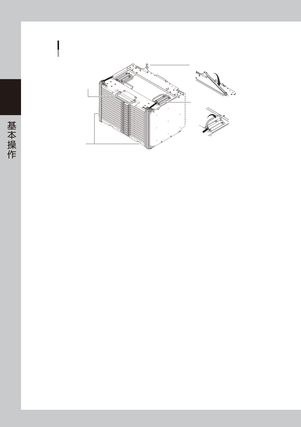 将载料箱装入托盘供料装置之前,请务必确认已将防止载盘滑落的止动杆向上拉起叠放在载料箱顶,顶部左右的把手也
