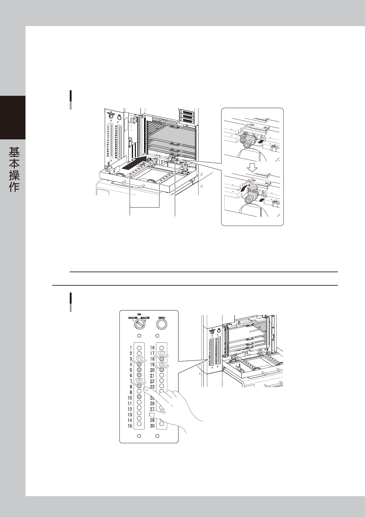 2. 确认载盘的朝向与插入层 ( 载盘安装层编号 ) 之后,插入补充了元件的载盘直到轻触载料箱的里侧。