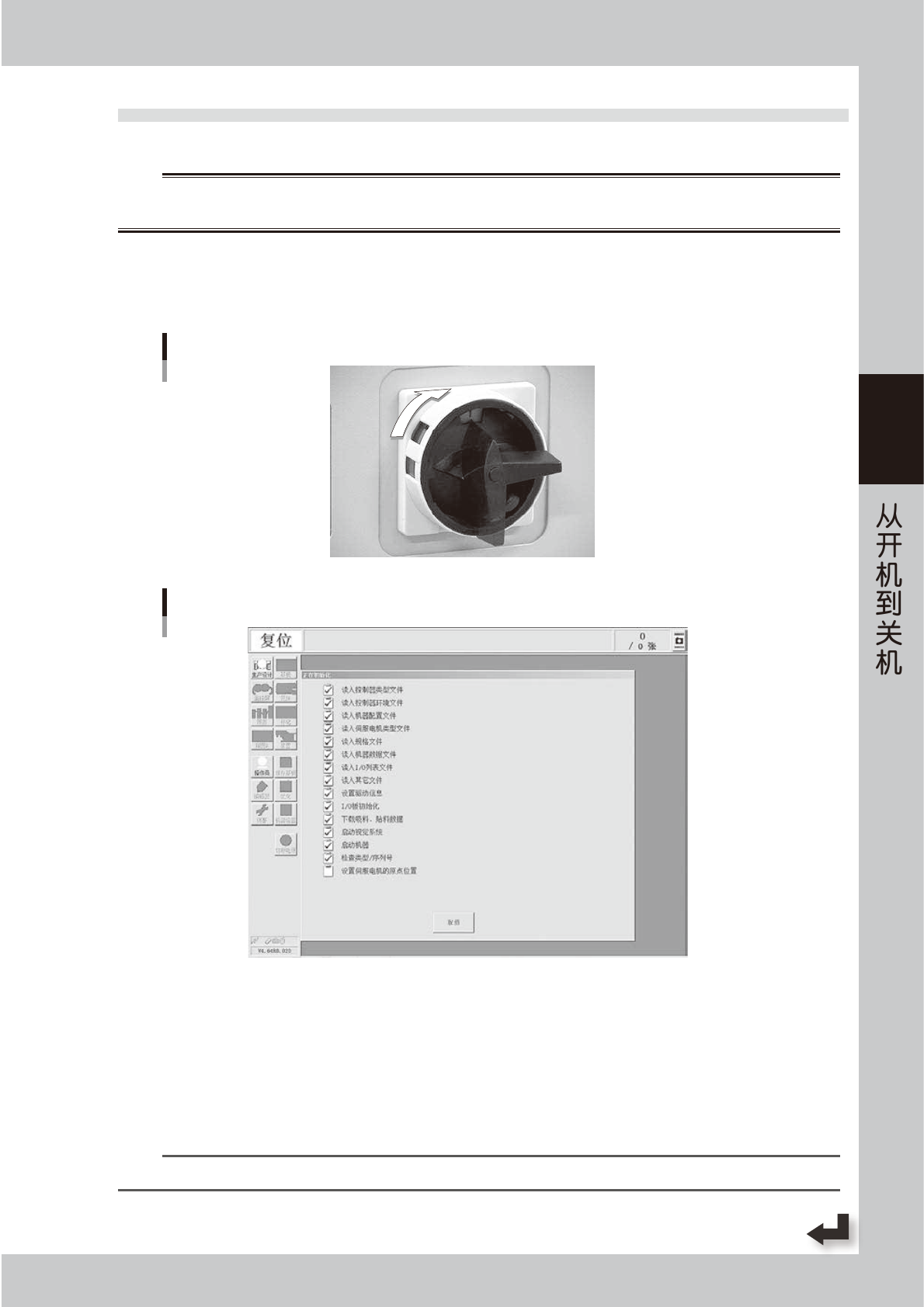 向右转动贴片机正面右下方的电源主控开关至 ON,接通电源。系统启动,显示“正在初始化”画面并