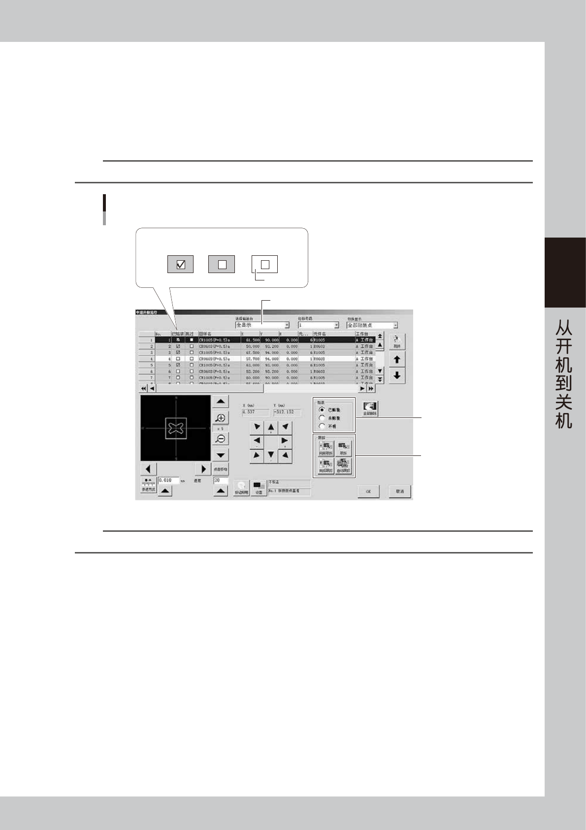 移到实际的贴装位置。通过相机确认基板上的贴装点之后,点击“贴装”分组框中的单选按钮选择贴装状态。