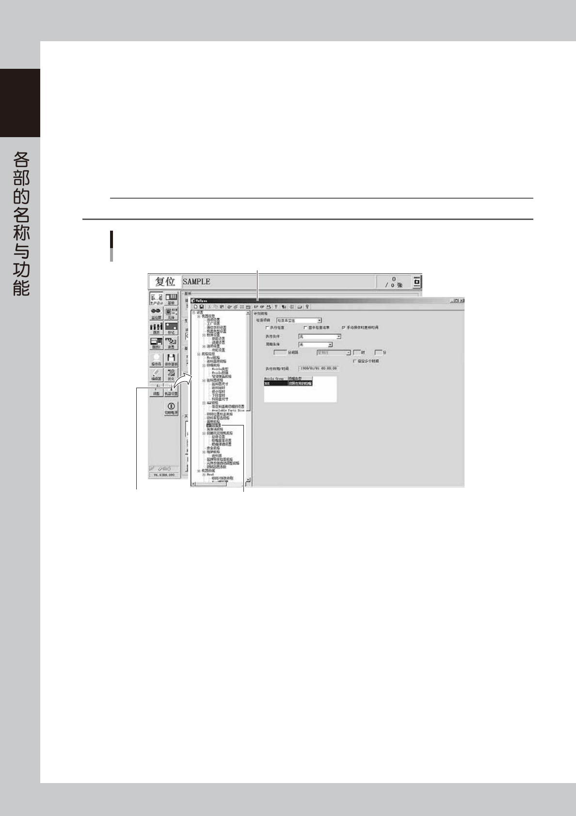 1-20 1 3.4.3 自动进行吸嘴轴排气的方法 本机可以使吸嘴轴在任意时间自动进行排气清洁。 下面,介绍设置方法。 1 按 [ 机器设置 ] 按钮。 打开“VmSpec”画面。 2 从树形菜单中选择“计划规格” 。 从树形菜单的“设置”-“规格信息”下选择“计划规格” ,打开“计划规格”画面。 n 要点 计划规格画面的设置需要有管理员权限。 打开“计划规格”画面 [机器设置] 按钮 选择“计划规格” “VmSpec”画面 26105…