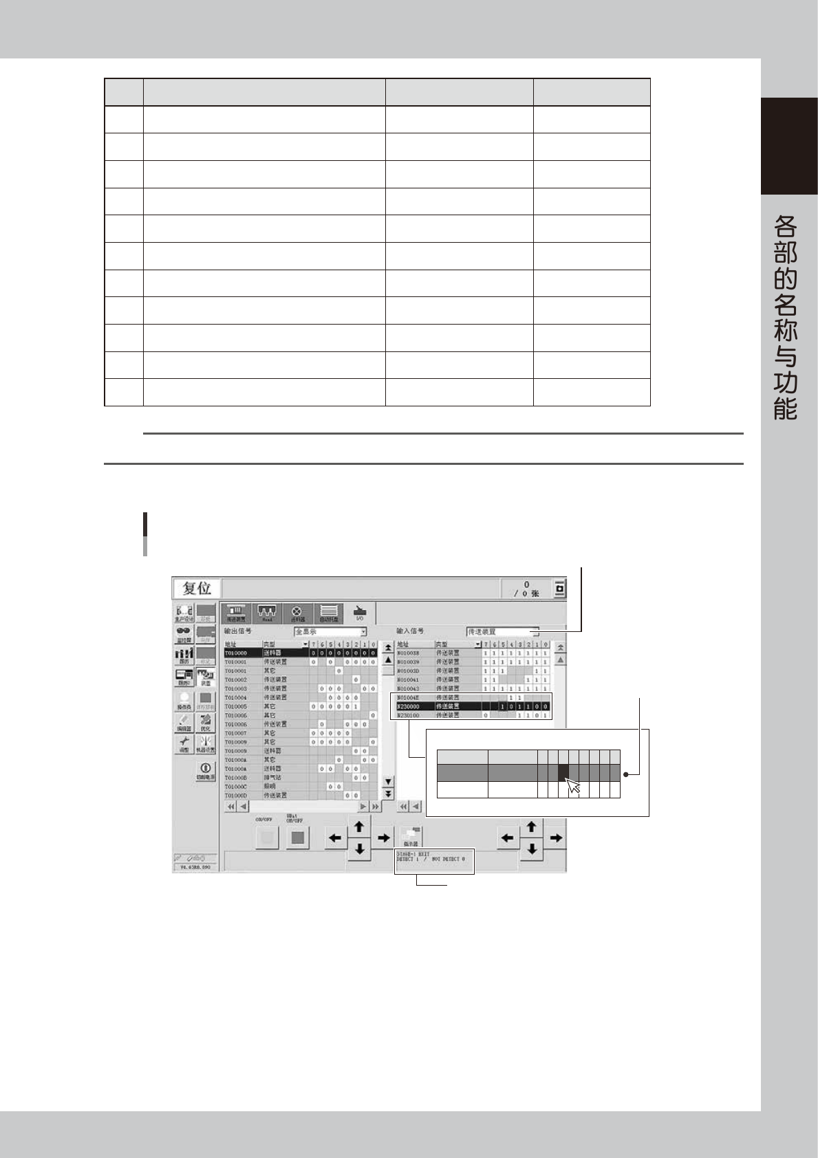 传送部的传感器状态可以在 [ 装置 ] -“I/O”画面确认。