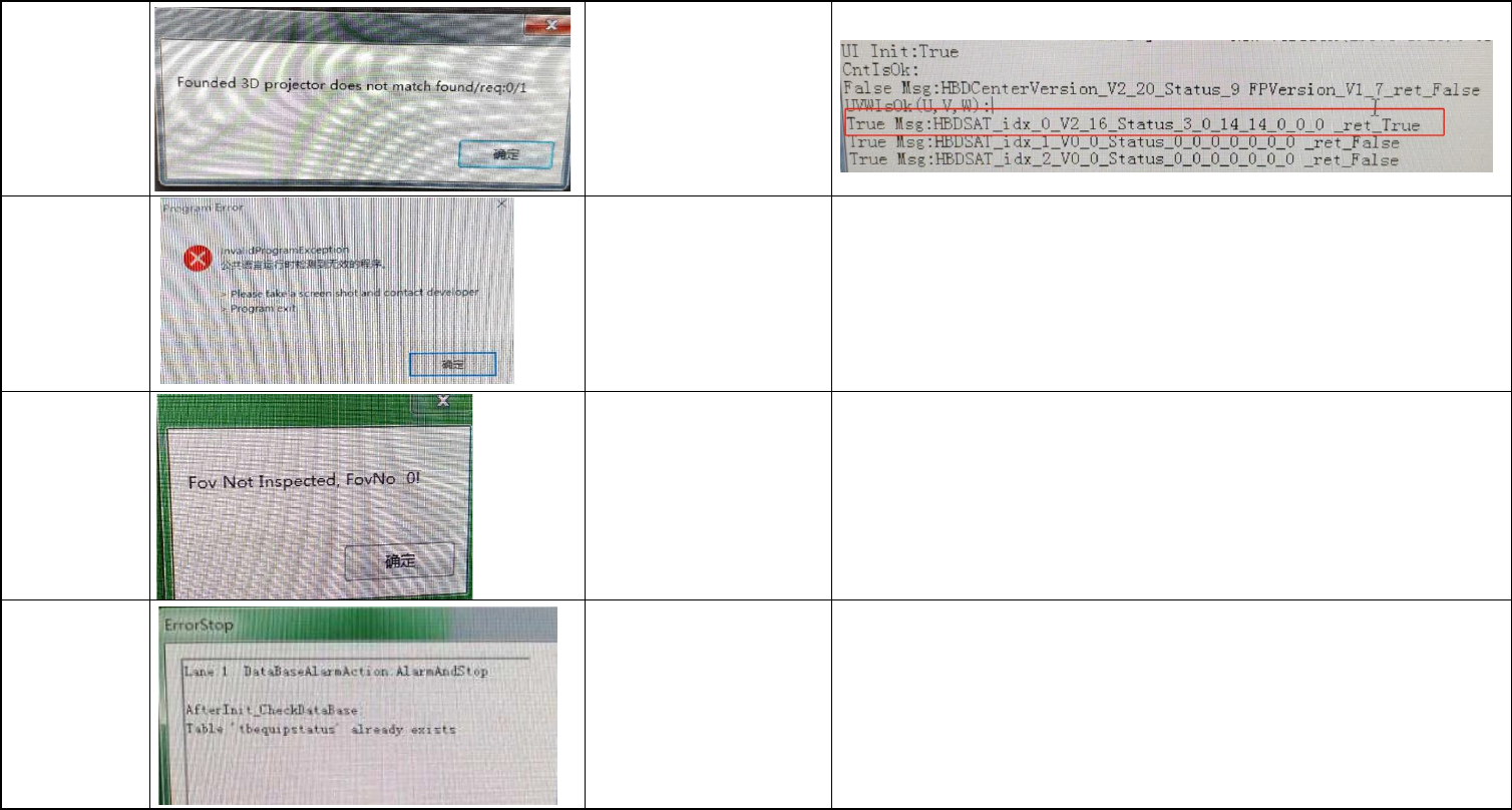 97 打开UI报错 检查3d头有个闪亮的指示灯是否闪亮?log是否报 错? 98 打开UI报错 BIN下面这两个文件StandardModbusApi_w10.dll和 ModbusTcpAPI_w10.dll后面-w10去掉就可以了。 99 UI测试过程中报错 有一些版本有这个BUG,放下补充文件就可以了或者 升级更新的版本。 100 UI打开报错 把MYSQL数据清空后可以了