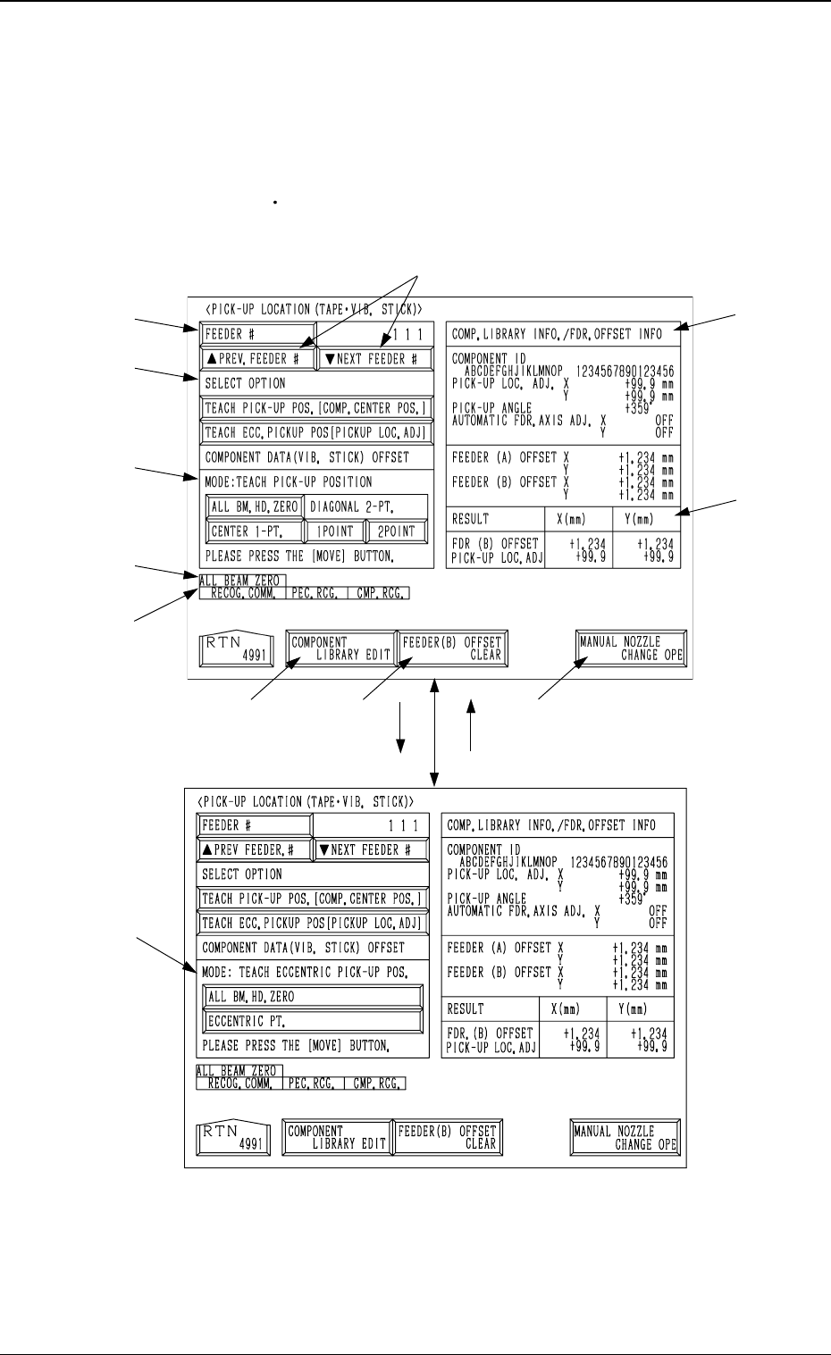Tg0249-PM-MM *1 [FEEDER #] Key When this key is pressed, the “PICK-UP LOCA TION TEACH - SET FEEDER” display (Fig. 3.67-1) appears on the screen, enabling the setting of the feeder No. whose pick-up location must be taugh…