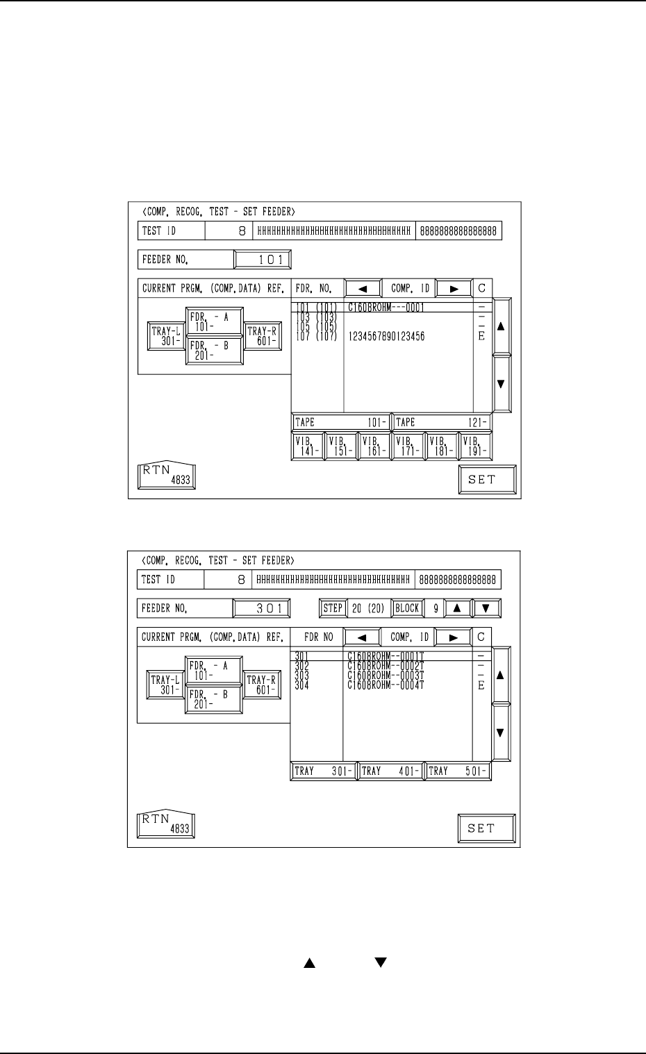 Tg0249-PM-MM 7. DEVICE TEST Display 7.2.2 COMP . RECOG. TEST - SET FEEDER Display • This display allow the operator to specify the slot No. of the feeder from which the component should be taken out for the component rec…