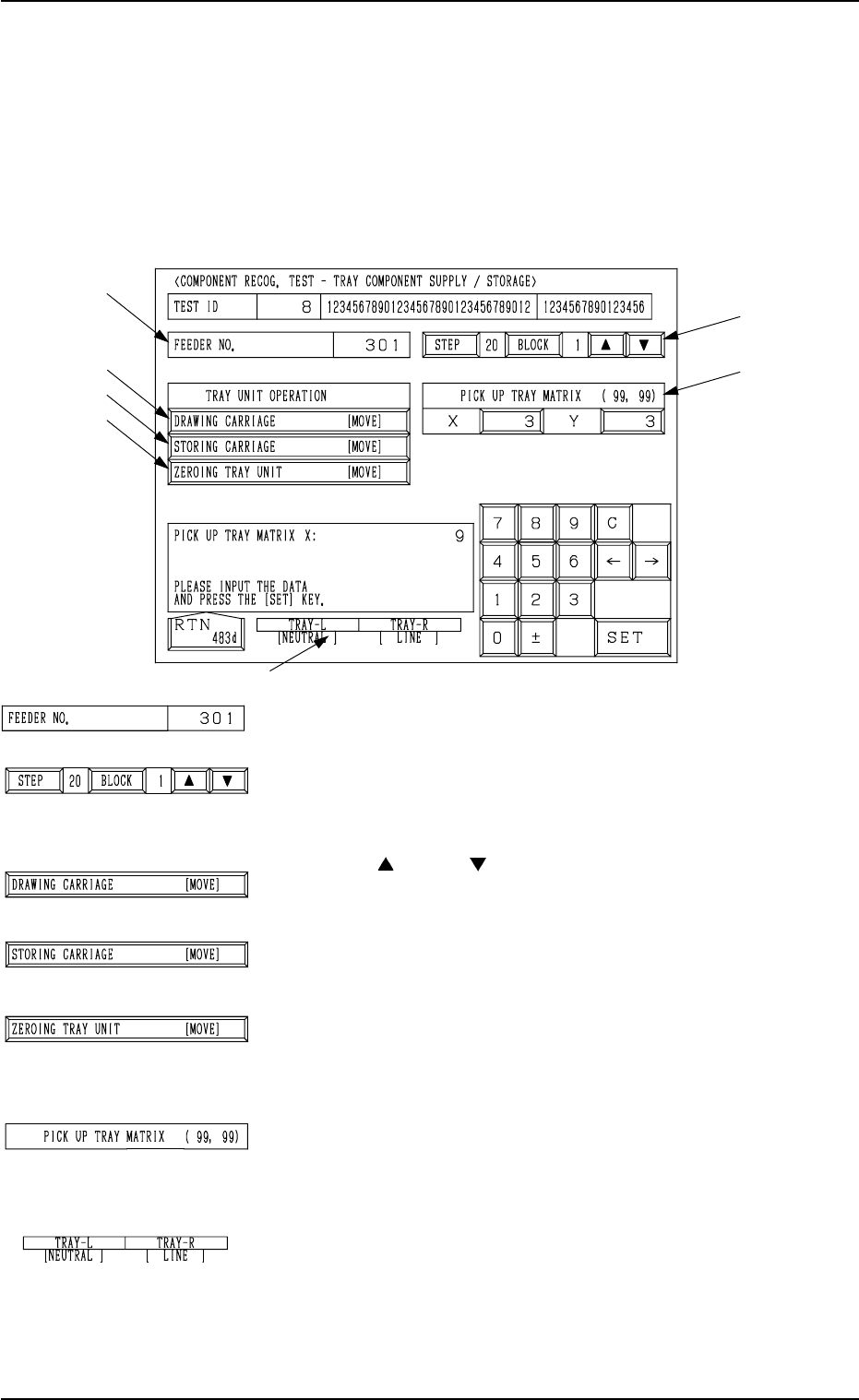 Tg0249-PM-MM 7.2.5 COMPONENT RECOG. TEST - TRA Y COMPONENT SUPPL Y/ST ORAGE Display (Option) • This display allows the operator to draw out and store the tray components (pallet) and change the tray pick-up matrix when t…