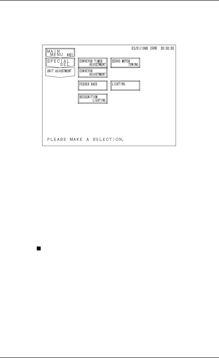 9910-001 Tg0249-PM-MM 9. UNIT ADJUSTMENT Display When the [UNIT ADJUSTMENT] key is pressed at the “SPECIAL SEL.” display , the following display appears on the screen. [CONVEYOR TIMER ADJUSTMENT] Key When this key is p…