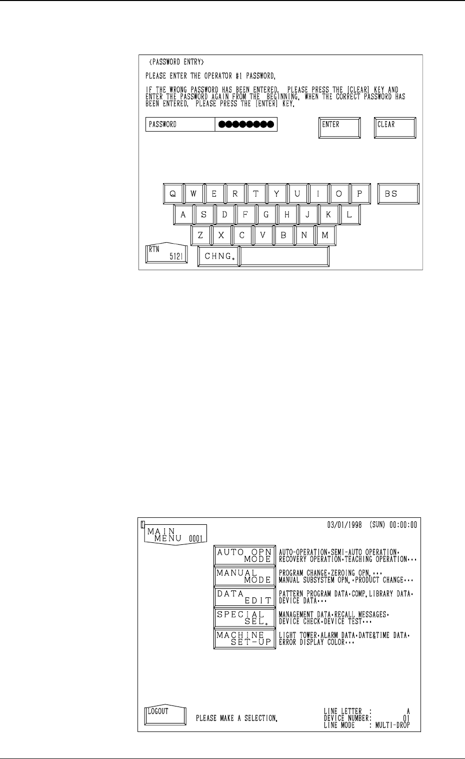 Tg0249-PM-MM 0004-002 4-7 (3) The “P ASSWORD ENTR Y” display (Fig. 4.6) appears on the screen. Enter the password and press the [ENTER] key . If the password is cor- rect, the “MAIN MENU” display appears on the screen. (…