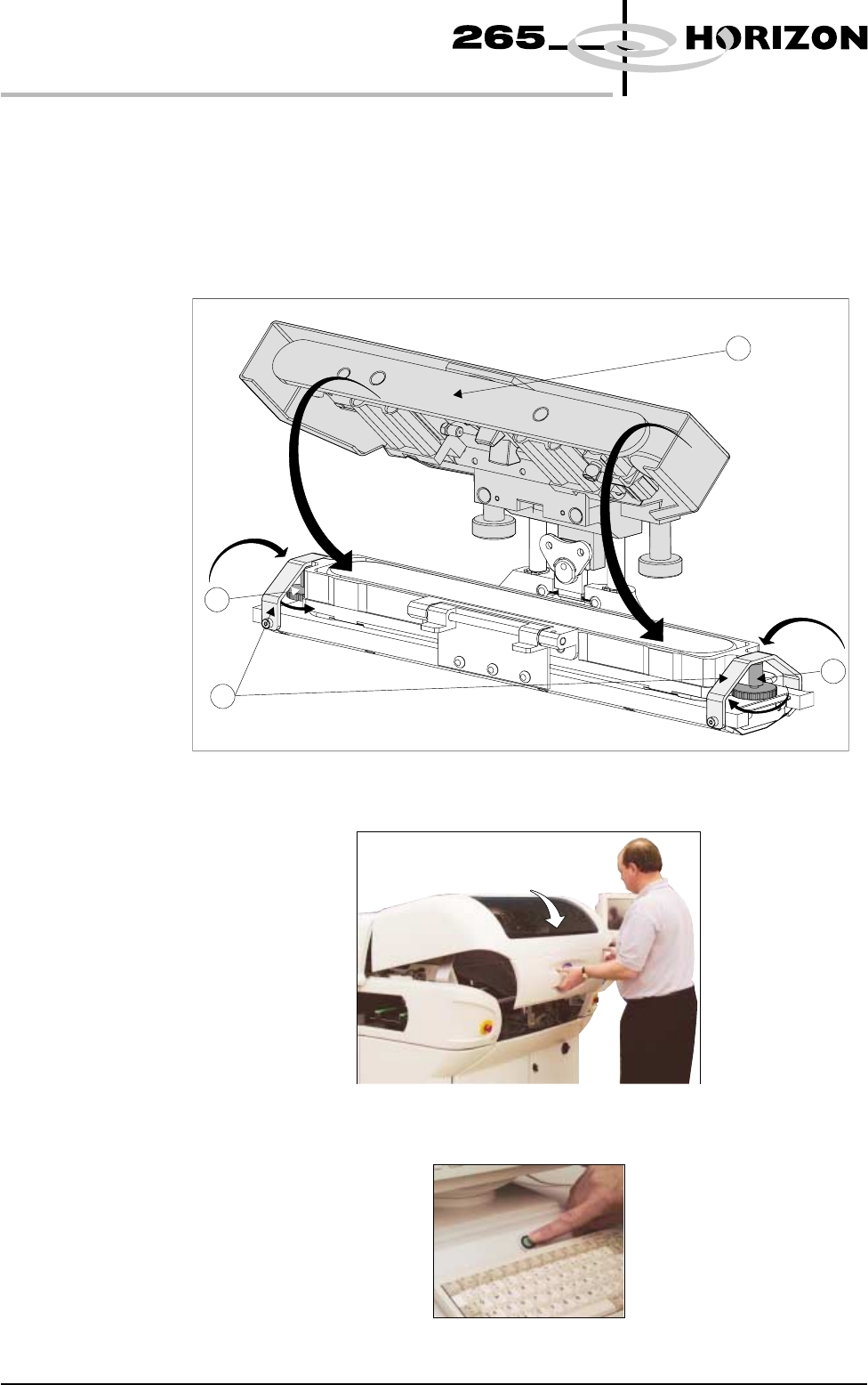 27. Lower the pressure mechanism (3) in place until the latch engages.