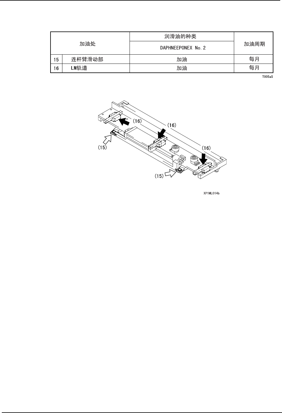 MEC-XP143-1.0S 4. 维修保养 XP-143E 机械手册 47 4.2.8 废料带切刀的加油处 插图内的箭头表示加油处。特别 是黑箭头为必须用润滑油枪加油的地 方。