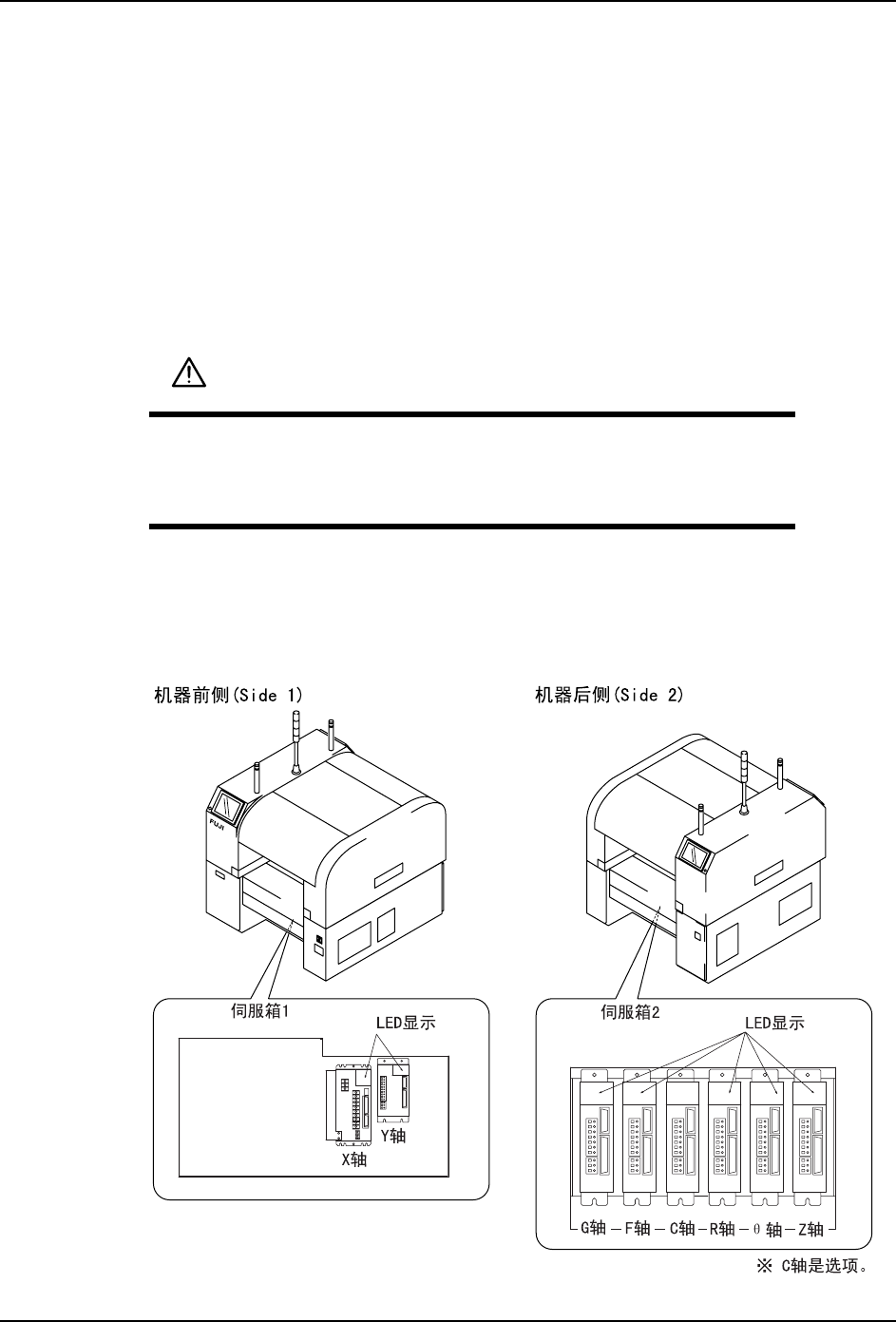 内存有电池。机器的操作画面上显示出 「伺服放大器异常」,伺服放大器前面的 LED 显示