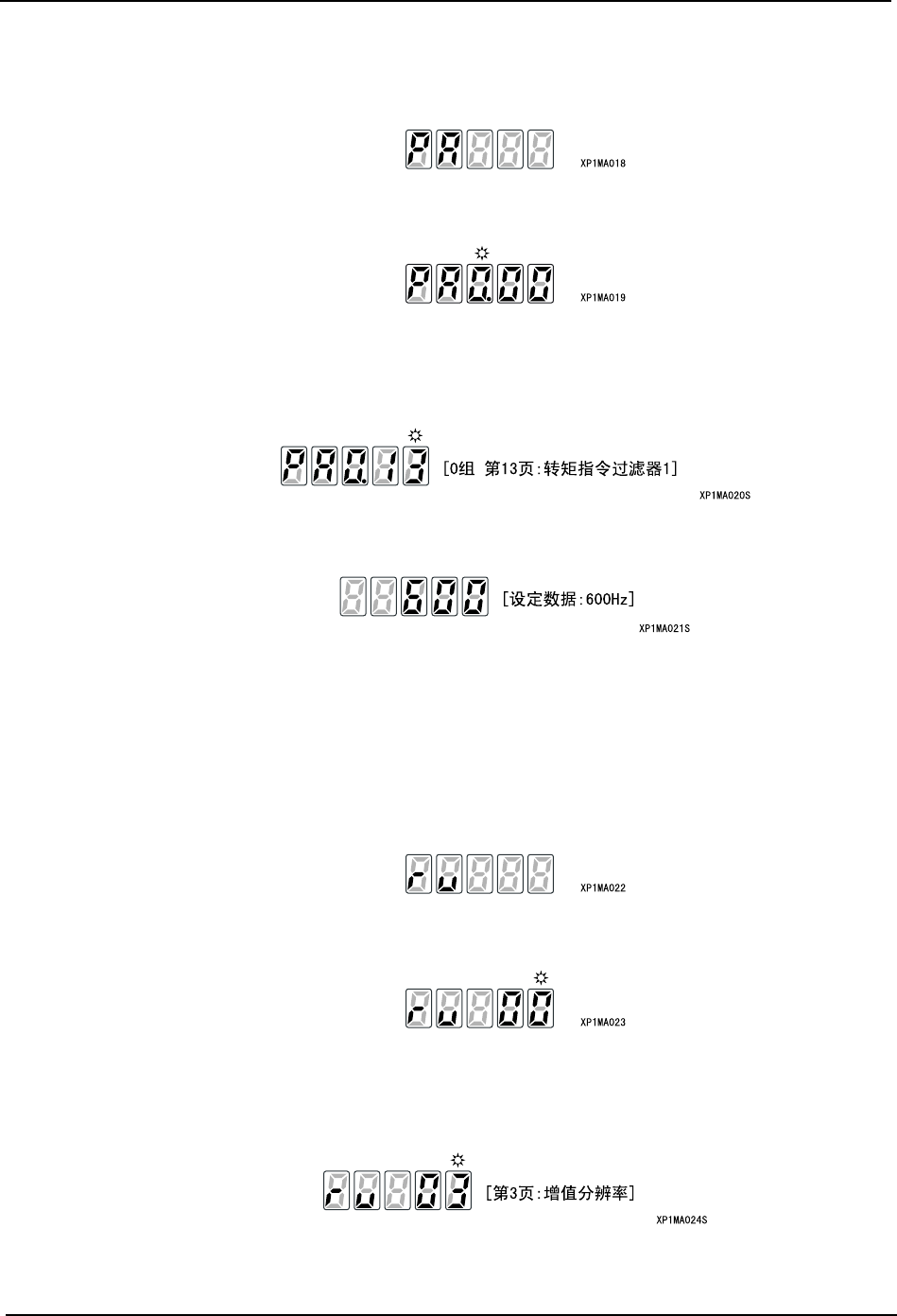 MEC-XP143-1.0S 5. 调整 XP-143E 机械手册 67 参数确认模式 1. 多次按 Mode Key 直至显示 出 「 PA」 ,切换到参 数确认模式。 2. 自动切换到如下所示的 「页选择显示画面」的显示。 3. 按 「Up Key」或者 「Down Key」显示出要 监视的页。按 「Up Key」 向后翻页,按 「Down Key」返回 到前页。显示 的下两位数代表报 警代码。如图所 示,显示出 「群组: 0 第 …