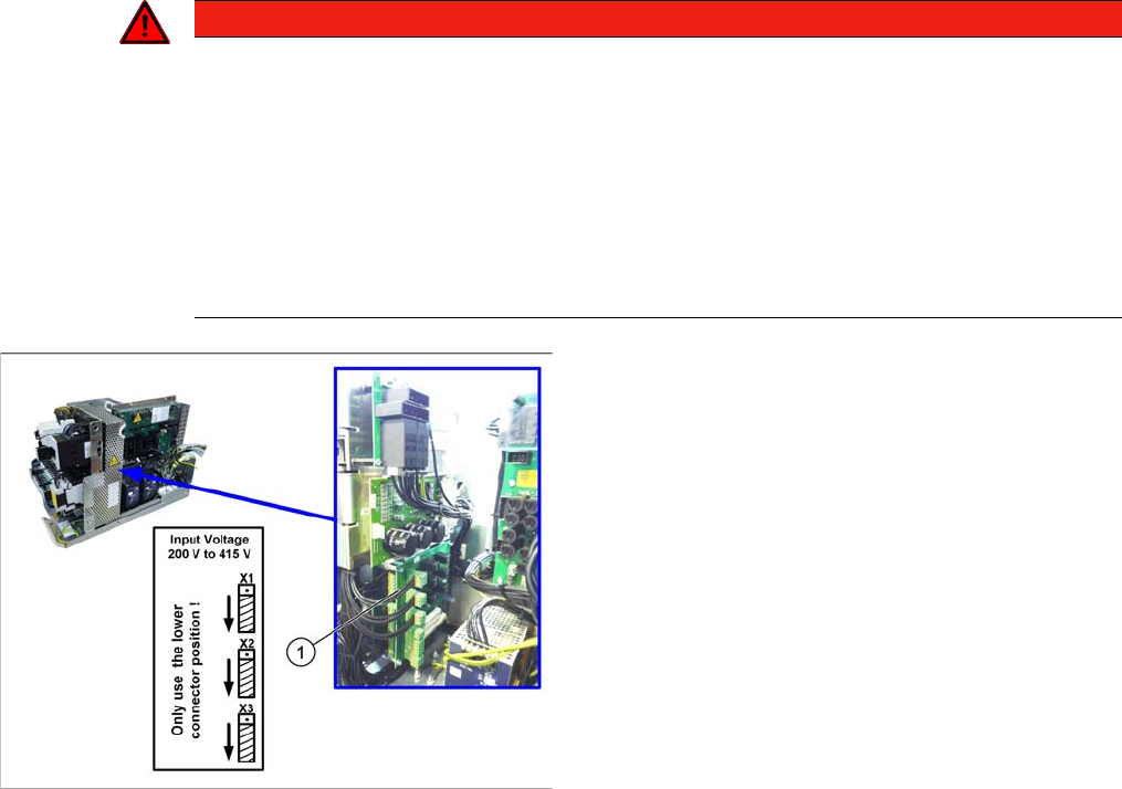 ► Überprüfen Sie am Klemmenfeld (1), ob die Primärseite des Drehstromtransformators (Kabel zu (2))