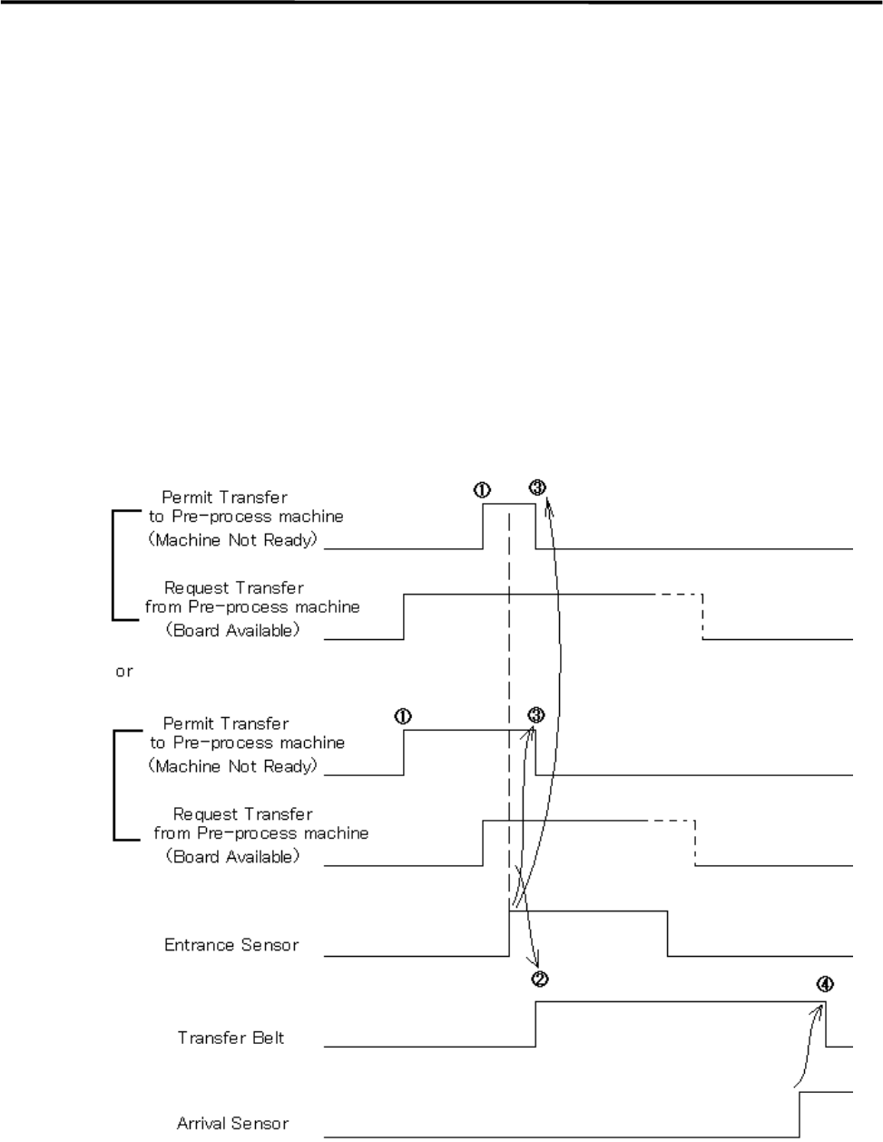 1 Installation 1-18 Sequence of Sending PC board (SMEMA Interface spec.) ① When the machine is ready to se nd PC board, the Request Transfer (Board Avai lable) is sent to Post-process machine. ② The transfer belt will be…