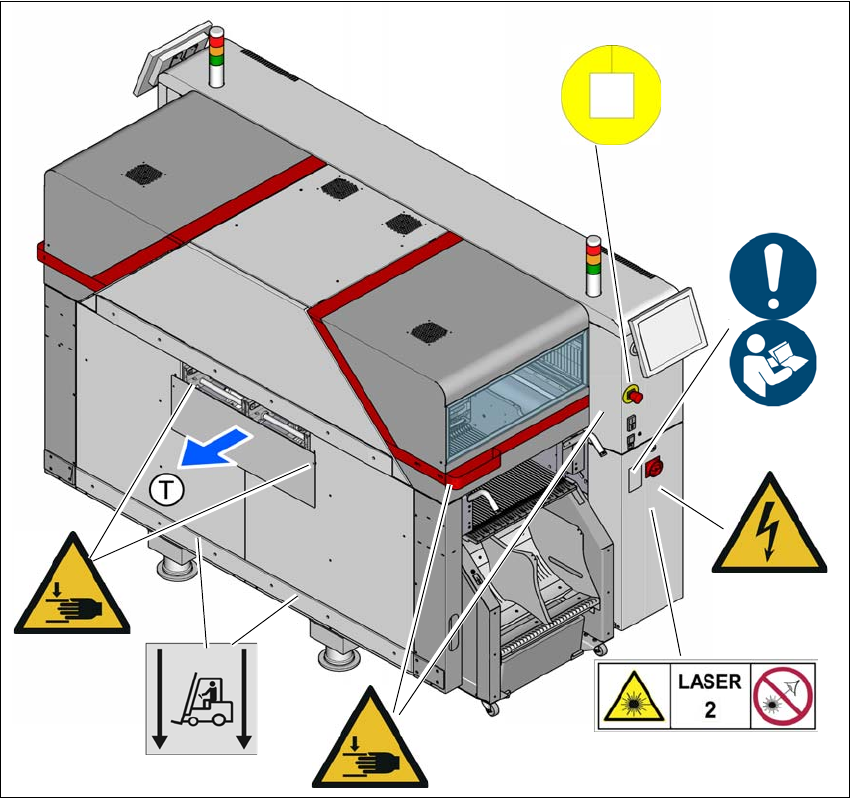 The following diagrams show the SIPLACE TX2. The position of the warning labels is the same