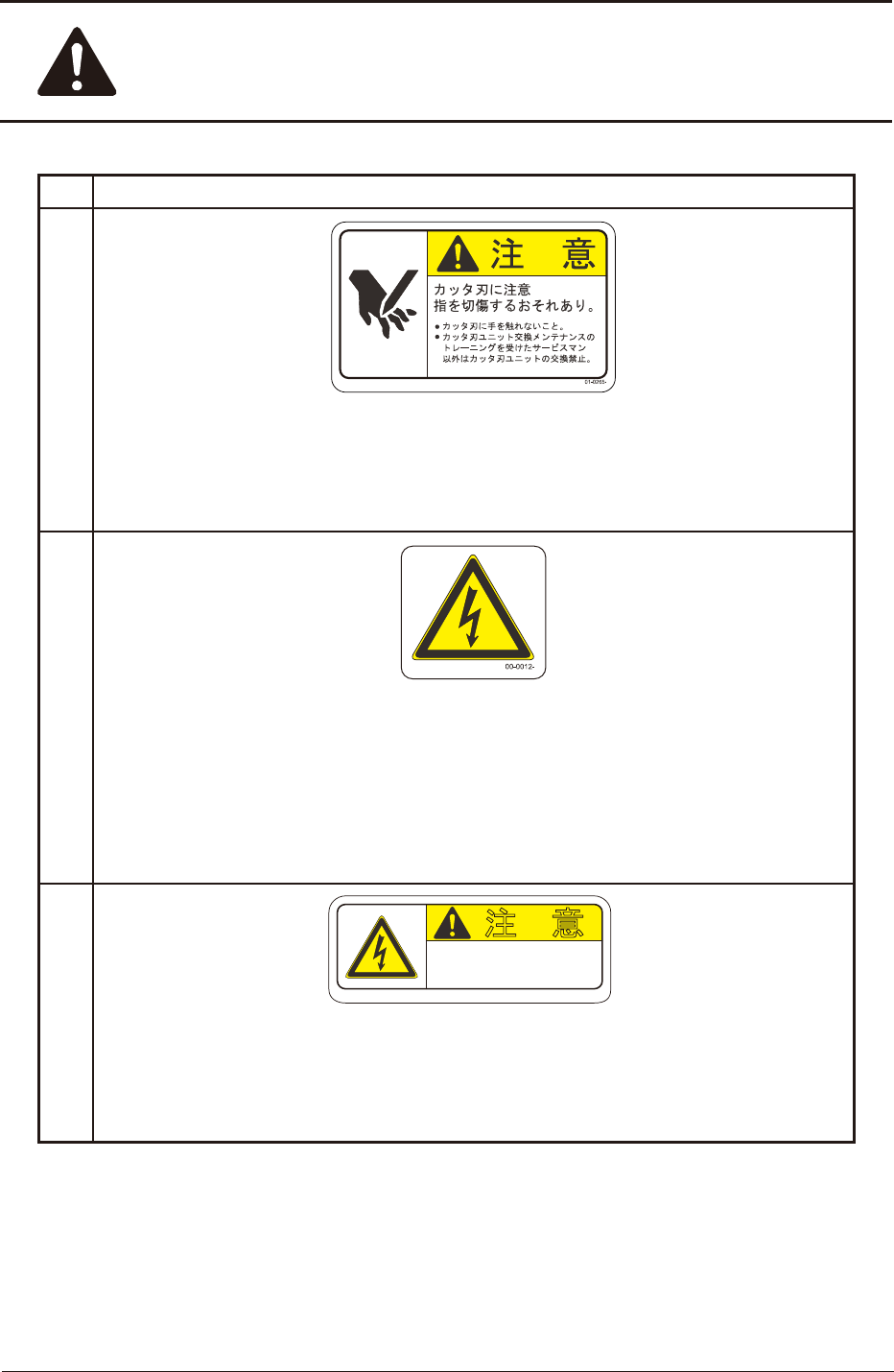 安全 -30 1OM-1839 1603-001 5. 本装置の警告ラベル No. 警告ラベルと説明 (7) 指挟みに注意 01-0281- 注 意 扉は取っ手を持ってゆっくり開閉しないと けがのおそれあり。 説 明 カバー ( 開閉カバー ) を開閉するときは、取っ手をしっかり持って、ゆっ くり上下させてください。 扉に手などをはさまれて、けがをするおそれがあります。 (8) 01-0268- 注 意 感電注意 ブレーカ1次側端子…