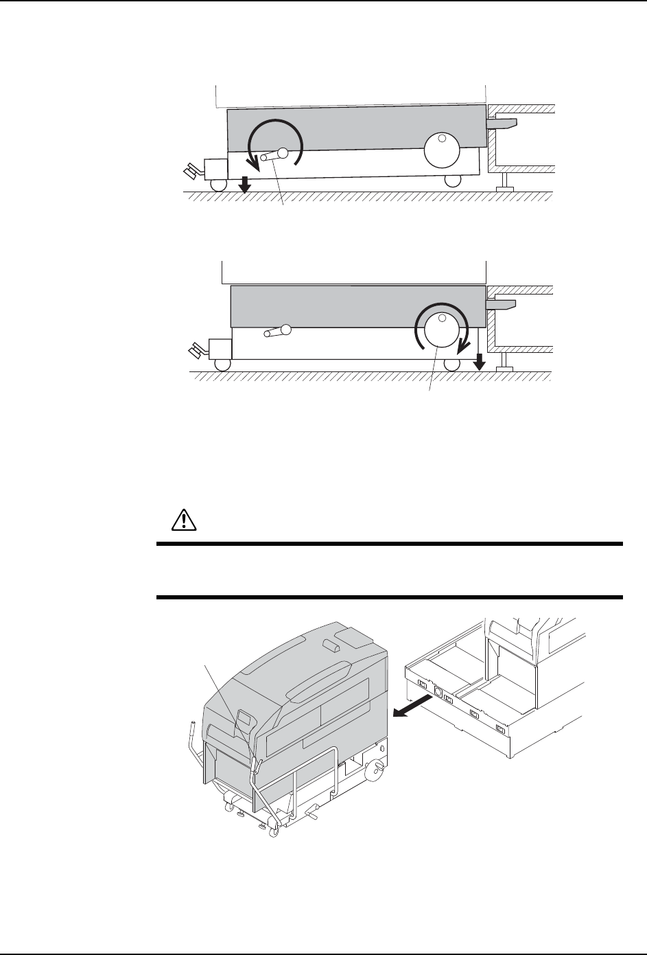 MEC-NXT3-004S0 4. 基本操作 NXT III 机械手册 105 8. 降低 MCU 的后轮 ( 仅仅限于用步骤 (3) 调整水平的时候 ) a. 旋转摇手柄,降低后轮 ( 提升升降脚 ) b. 同样,前轮也下降。 9. 从基座上将装载模组的 MCU 卸下。 a. 握住 MCU 的放松把手,解除 MCU 与基座的接合。 备注 )此时,MCU 的旋钮如果不处于 "LOCK" 位置上,不能操作放松把手。 b…