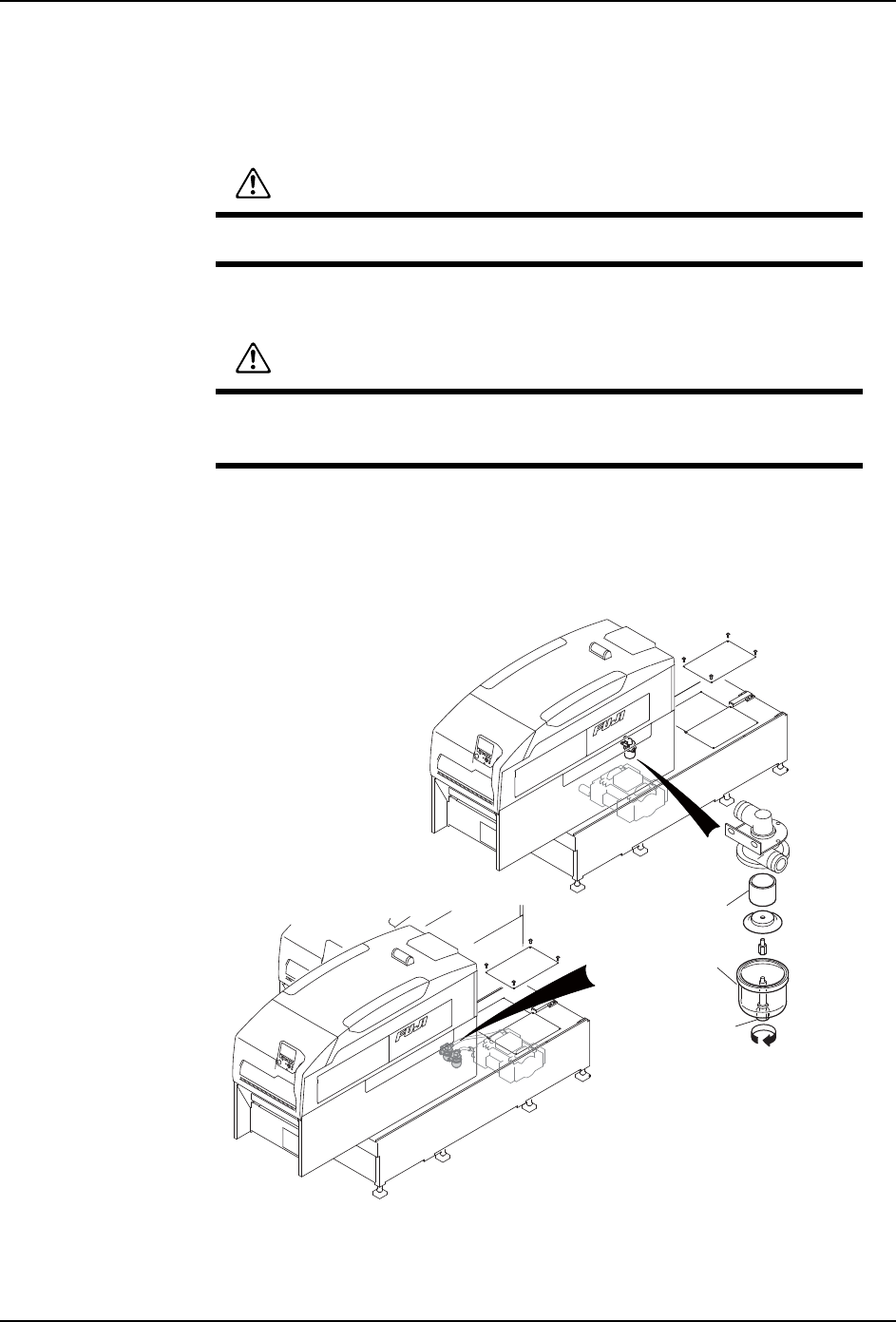 5. 预防保养 MEC-NXT3-004S0 252 NXT III 机械手册 5.10.2 真空泵过滤器的清扫 1. 拉出模 组。 (参考 「4.1 模组的 拉出 / 插入 」 ) 2. 请将主电源开关 OFF。 3. 从基座上拆除盖板。 4. 请将真空配管内设定为大气压。 5. 松开滤器套下面的螺栓,从过滤器上拆除 滤器套。 6. 从过滤器里取出滤芯。 7. 用中性洗涤剂清洗过滤器套。 8. 用压缩空气吹气清扫滤芯或者在污垢严重 时…
