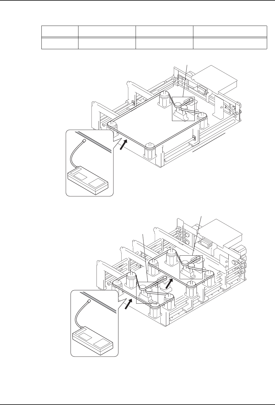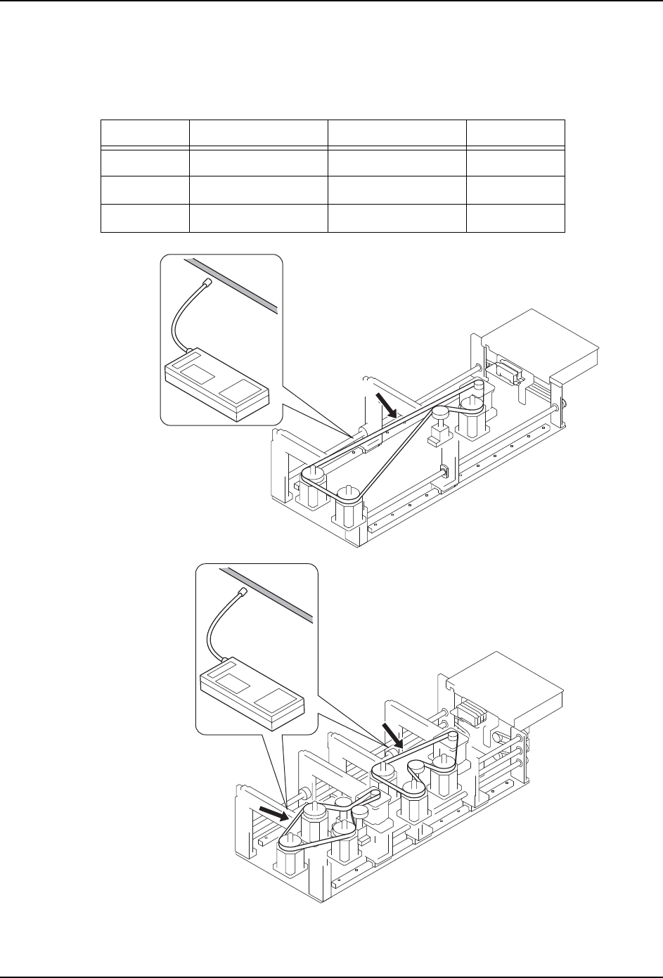 MEC-NXT3-004S0 5. 预防保养 NXT III 机械手册 323 5.11.14 搬运轨道 CZ 轴皮带张力的检查 · 调整 在发生如电路板异常的时候,请 检查搬运轨道传送带。 M3-3 模组搬运轨道的规定张力 图中记号 调整时张力 (Hz) 许容张力 (Hz) 备注 A 42±10 25 ~ 5 2 单搬运轨 道 B 156±10 94 ~ 1 66 双 搬运轨道 C 96±10 58 ~ 1 06 双 搬运轨道 0…