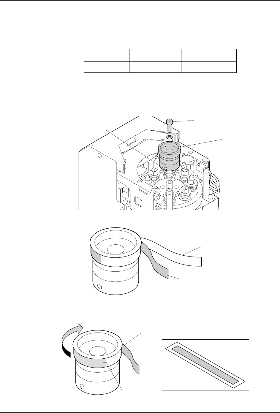 6. 消耗品的更换 MEC-NXT3-004S0 352 NXT III 机械手册 备注 ) 1.请顺时针方向卷贴纸。 2.请注意在贴纸下不要混入气泡和异物。 3.卷曲结束后请重叠贴纸粘贴。 5. 请在盖帽上粘贴透明贴纸。请确认先前粘 贴的贴纸端面,在这个相反的位置 上与透明贴 纸边对齐后开始粘贴。 备注 )请注意在透明贴纸下不要混入气泡和异物。 6. 将盖帽的螺丝位置与轴的平面部对齐,将 盖帽镶入轴。 7. 请拧紧螺丝,用螺栓固定盖帽…
