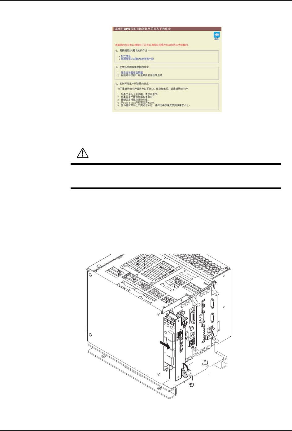 3. 主电源开关 OFF 后,取出 CPU 箱的布线。(请参考。) 「7.6 模组 CPU 箱的更换」
