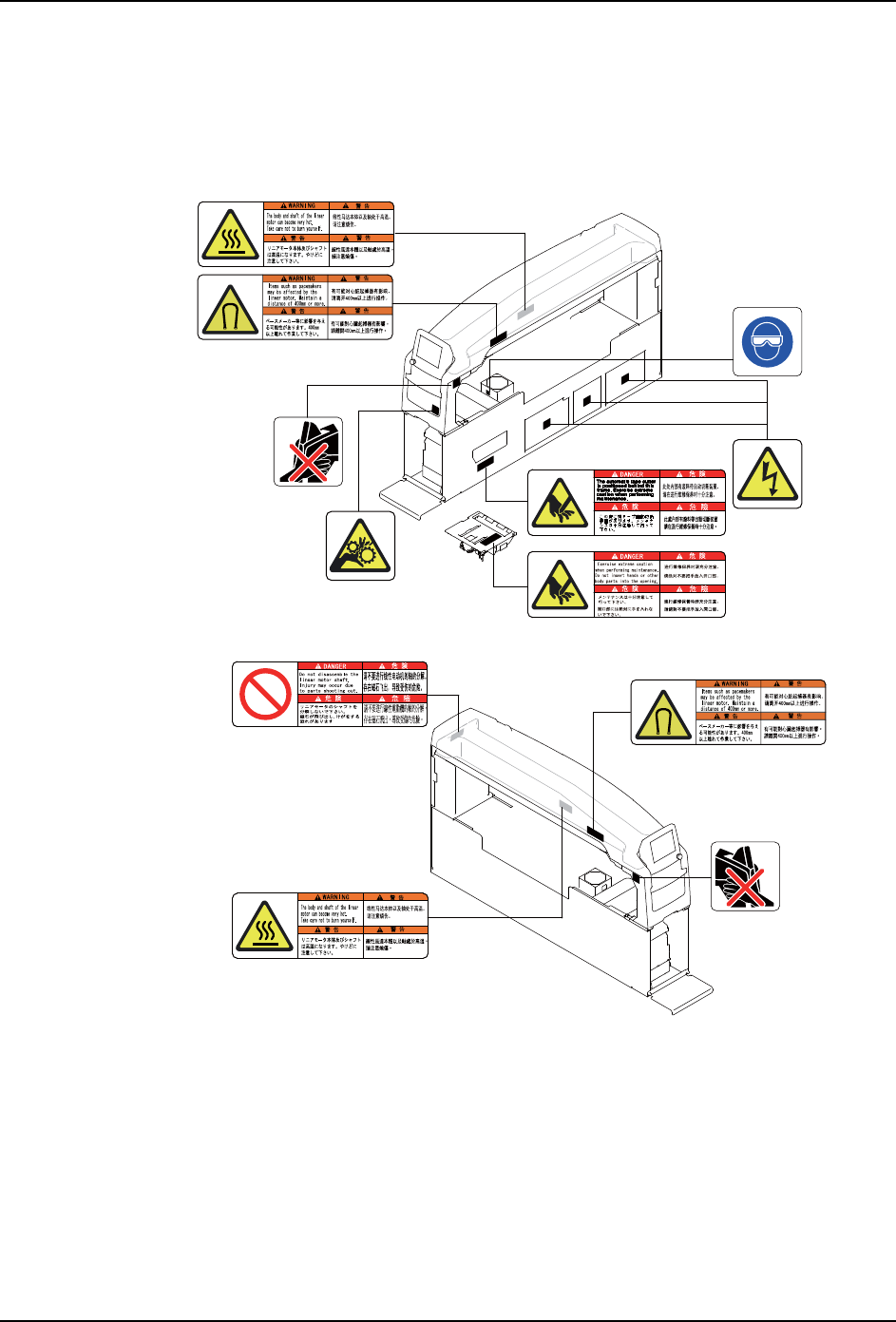 MEC-NXT3-00 4 S0 1. 安全指南 NXT III 机械手册 17 1.3.3 料盘单元 -M 01MEC-01559 41 43 40 42 相关章 节 40 向机器本体安装、或者从机器本 体上拆除料盘单元 -M 时,请 注意手不要伸入料盘单元 -M 与料站托架之间。 5.8.8, 5.10.25, 5.10.26, 5.10.27, 6.24 ·手指有可能被夹在料盘单元 -M 与料站托架之间而受伤。 41 向机器本体安…