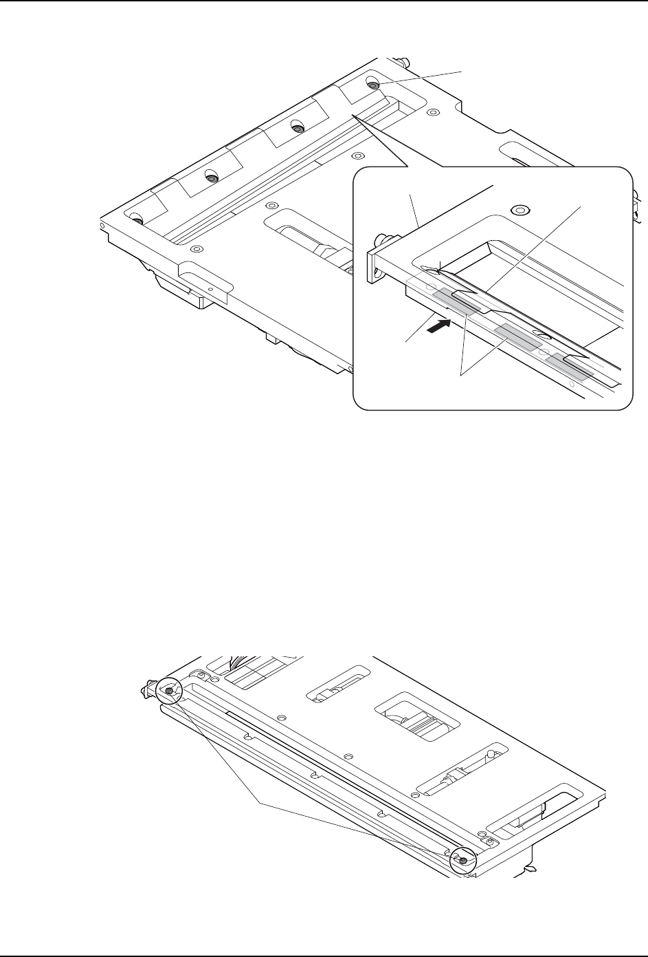 MEC-NXT3-004S0 6. 消耗品的更换 NXT III 机械手册 389 12.请将废料带处理单元从刀刃对齐调整治 具上拆除下来,置放在操作台上。 13.请一边将滑槽盖板按下图的箭 头方向压入。一边用螺栓固定。 14.请安装输送槽。固定输送槽时,请一边 压入固定刀刃,一边固定螺栓。 15.使可动刀刃前后移动,确认滑 动盖板和输送槽不相碰撞。 备注 )如果滑动盖板和输送槽相互碰撞,请把输送槽安装位置 移开到不相碰撞的位置。 16…