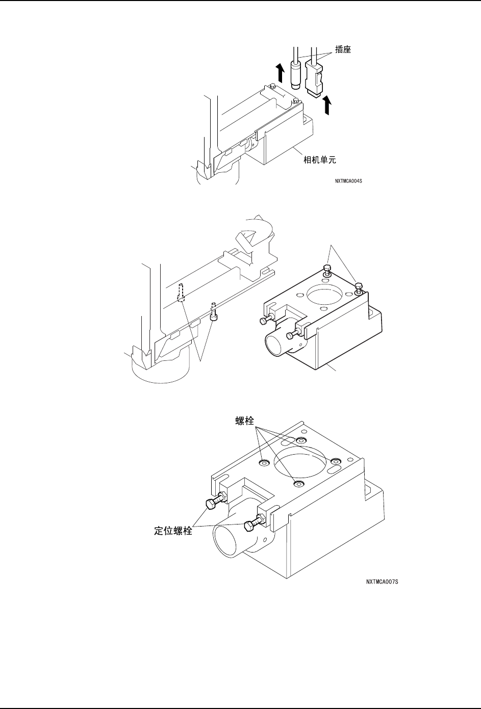 MEC-NXT3-004S0 7. 部件的更换 NXT III 机械手册 445 7. 拆除相机单元后部的插座。 8 . 拧 松 螺 栓( 2根)帽 和 六 角 螺 栓 ( 2根) 、 将 相 机 向 后 方 滑 出 并 取 下 。 注意 )请绝对不要松动相机单元的螺栓和定位螺栓。 1;70&$6E Ⳍᴎऩܗ ݁㾦㶎ᷧ 㧔 Փ⫼0݁㾦ᡇ 㧕 㶎ᷧᐑ 㧔 Փ⫼0݁㾦ᡇ 㧕