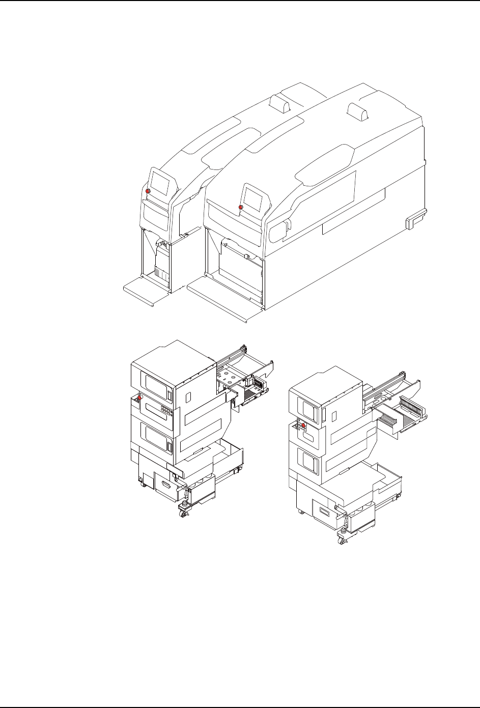 发生紧急情况时,请按下机器上红色的紧急停止按钮停止机器的运转。紧急停止按钮的位置
