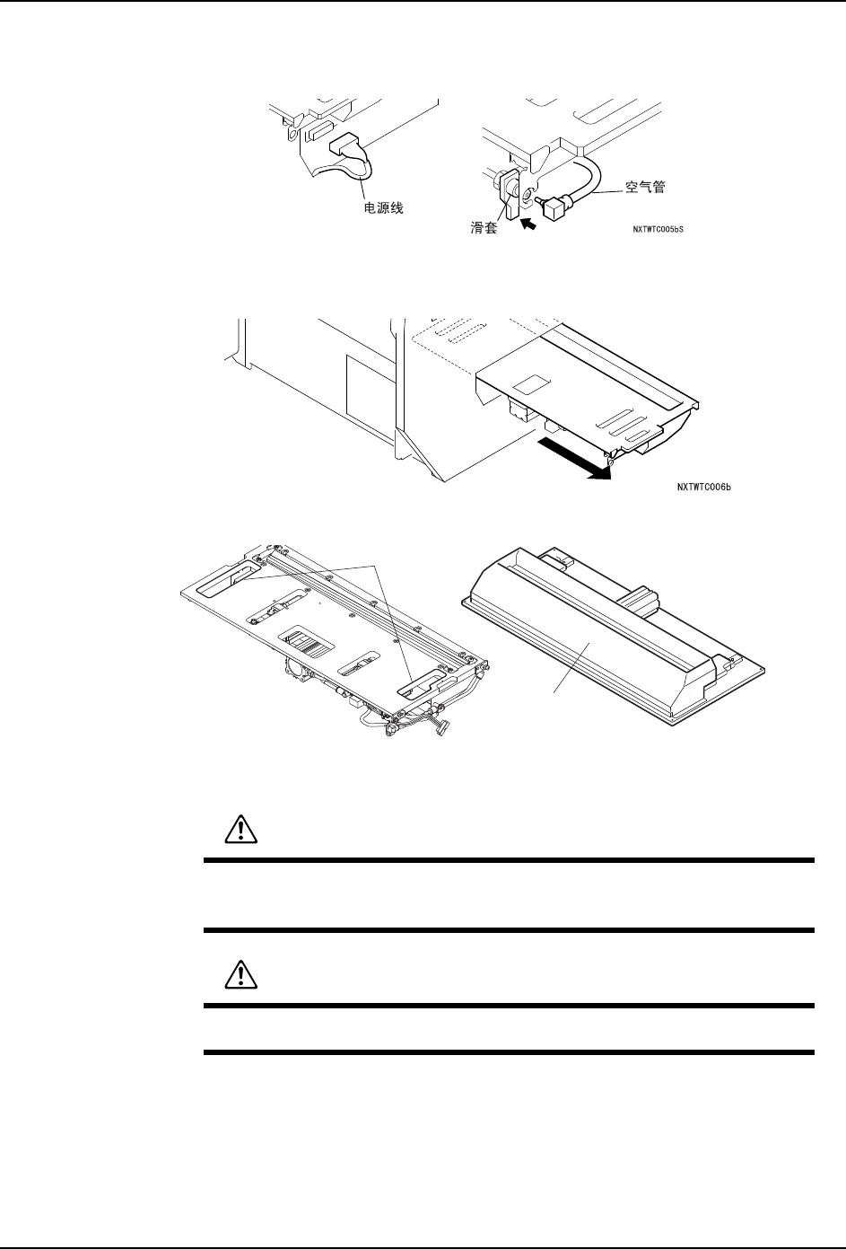 7. 拆除连接在废料带处理单元右侧的电源线插头,将空气管和滑套向下图箭头方向滑动并