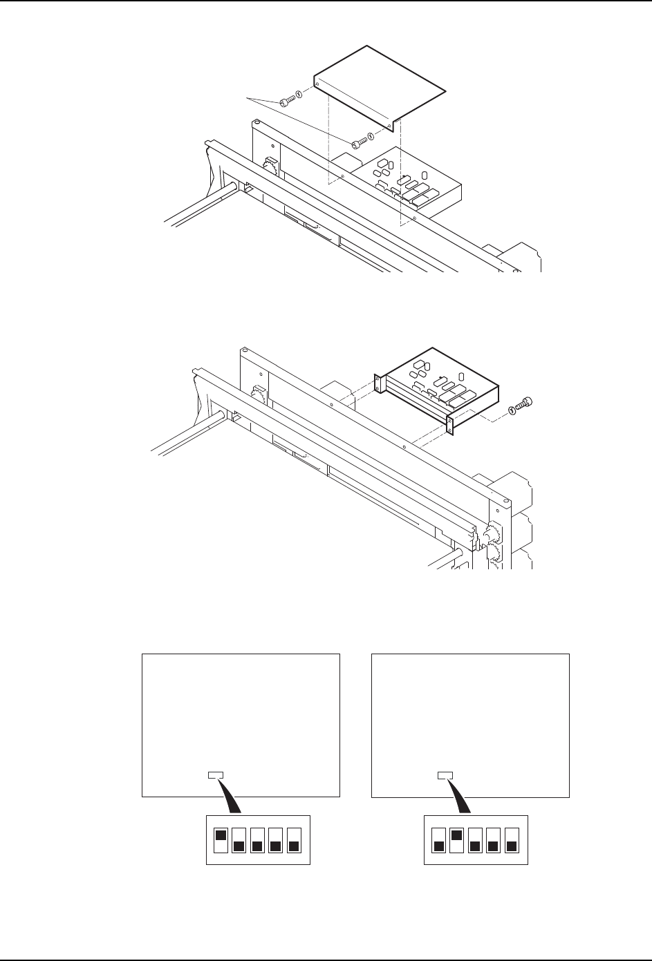 7. 部件的更换 MEC-NXT3-004S0 486 NXT III 机械手册 4. 拆下螺丝 (2 根 ),取下盖板。 5. 请从搬运轨道控制箱上取下接插件。 6. 拆下螺栓 (4 根 ),将搬运轨道控制箱与固定外壳一起拆下。 7. 请确认新控制箱的拨动式开关的设定。虽 然单搬运轨道和双搬运轨道的设定 相同,但是 M3 型和 M6 型上的设定不同。安装的搬运轨道和设定不 一致时,请根据以下进行设定。 01MEC-1463a 3.92…