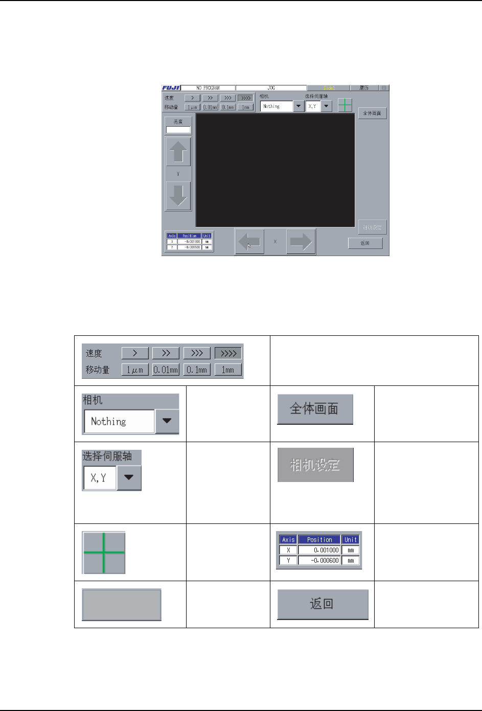 SYS-XPF-4.1S 3. 指令功能说明 XPF 系统手册 101 在 [JOG] 画面能进行下面的操作。 选择微动的移动轴 用微动移动轴, 在 [ 伺服轴选择 ] 组合框上选择。 选择移动轴后, 在画面左下显示的工作头 位置如下变化。 变更微动的移动速度 变更微动的移动速度时,选择 [ 速度 ] 项的 [>]、[> >]、[>>>]、[>>>>] 按键。[>] 变慢…