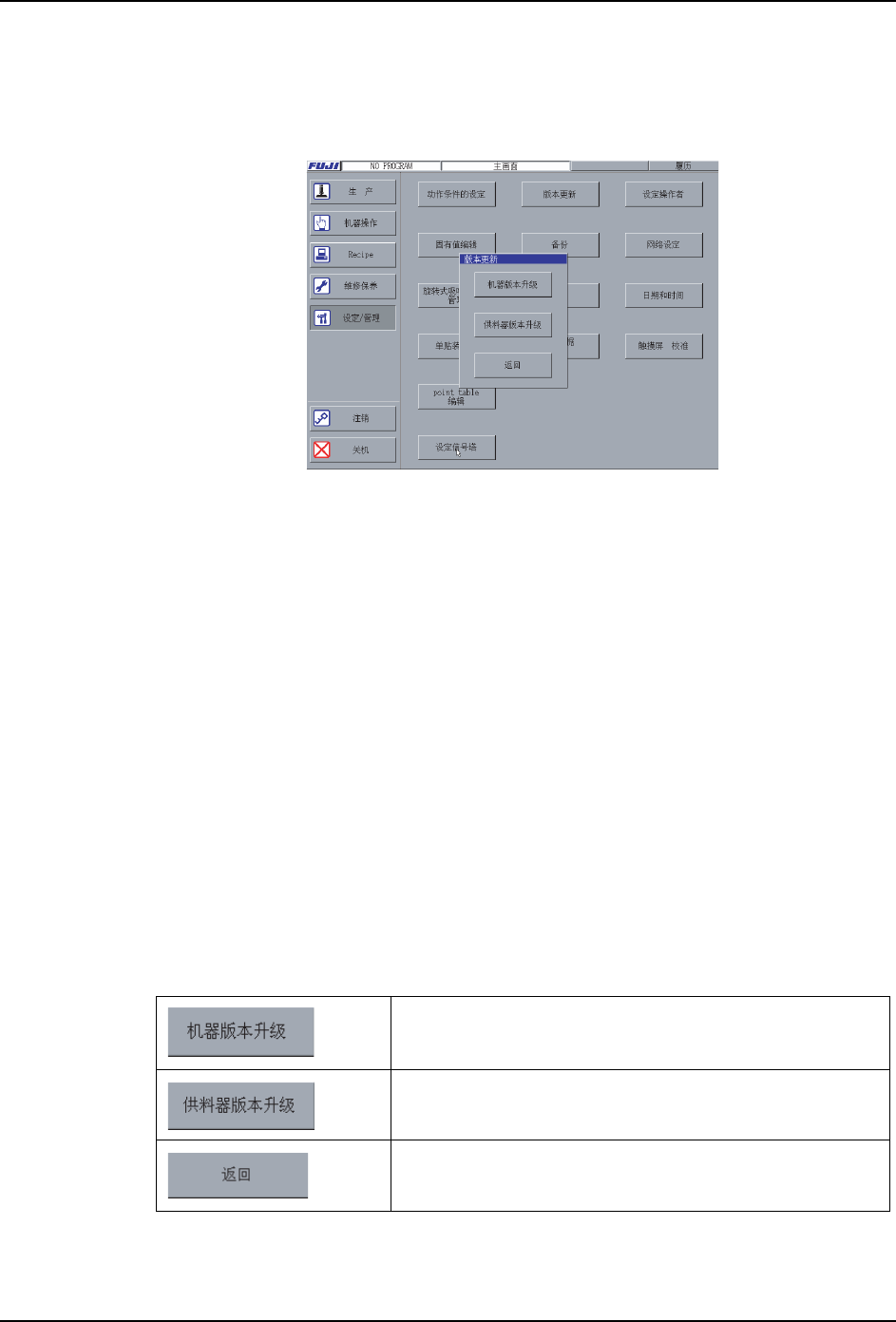 SYS-XPF-4.1S 3. 指令功能说明 XPF 系统手册 139 3.5.7 [ 设定 / 管理 ] - [ 版本升级 ] 功能说明 进行软件的版本升级。 表示步骤 从 [主画面]顺序选择 [ 设定 / 管理 ]、[ 版本升级 ]。 解说 [ 版本升级 ] 中可以进行下面 2 个版本升级。 · 应用软件 ( 机器控制 ) 软件的版本升级 · 装载在供料器上的软件版本升级 由 CD 提供应用软件。要版本升 级,需要插 入 CD 到机…