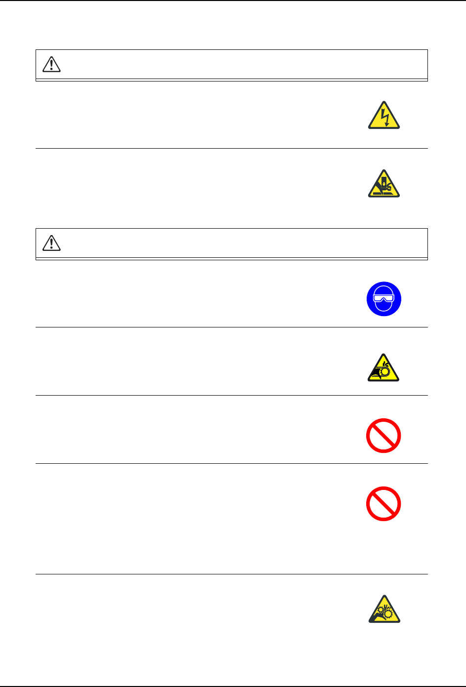 1. 安全指南 SYS-XPF-4.1S 4 XPF 系统手册 请不要在没有切断气源的情况下拆 卸汽缸、压缩泵、过滤器等。 · 如果不切断气源就拆除汽缸、压缩 泵 , 过滤器等部件,元件的 一部分或者异物有被空气吹入眼中 的危险。 · 在拆除汽缸、压缩泵 , 过滤器时,请务必关闭气源。 在拆除零部件时,请佩戴保护眼镜 。 · 在拆除或者更换零部件时,请佩戴 保护眼镜。 在单动操作中,请一边查看监视器 和工作轴一边进行操作。 · 在进行单…