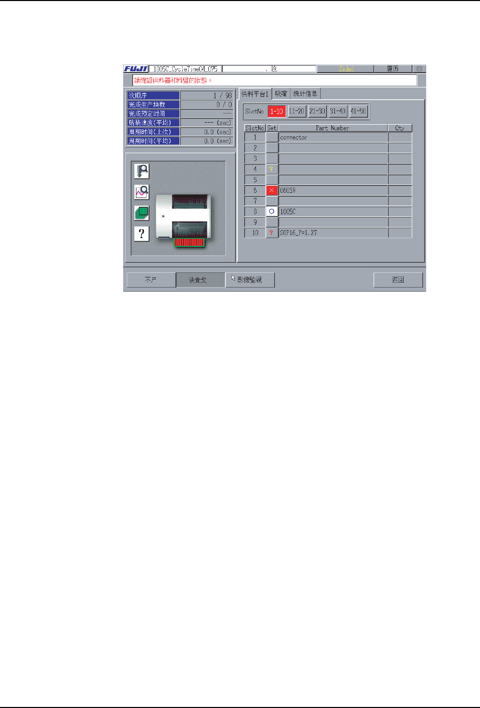 机器信息画面显示当前的供料器或者料盘的状态、吸嘴状态、统计信息等。