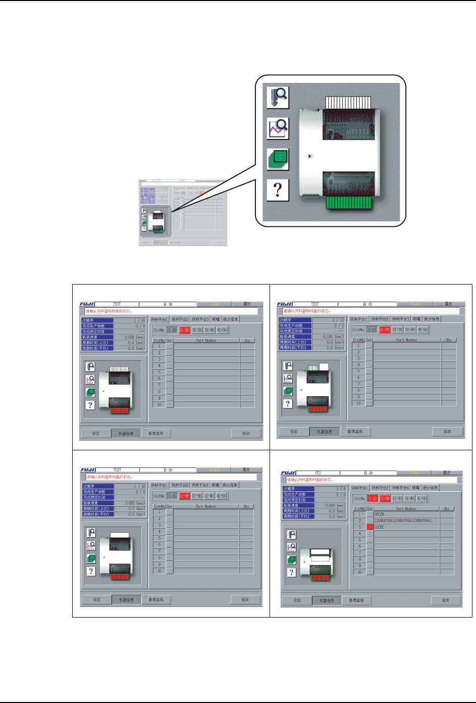 在这个区域上,在机器上进行贴装的元件供应单元(MFU、MTU 以及 BTU) 的状态的显示、连