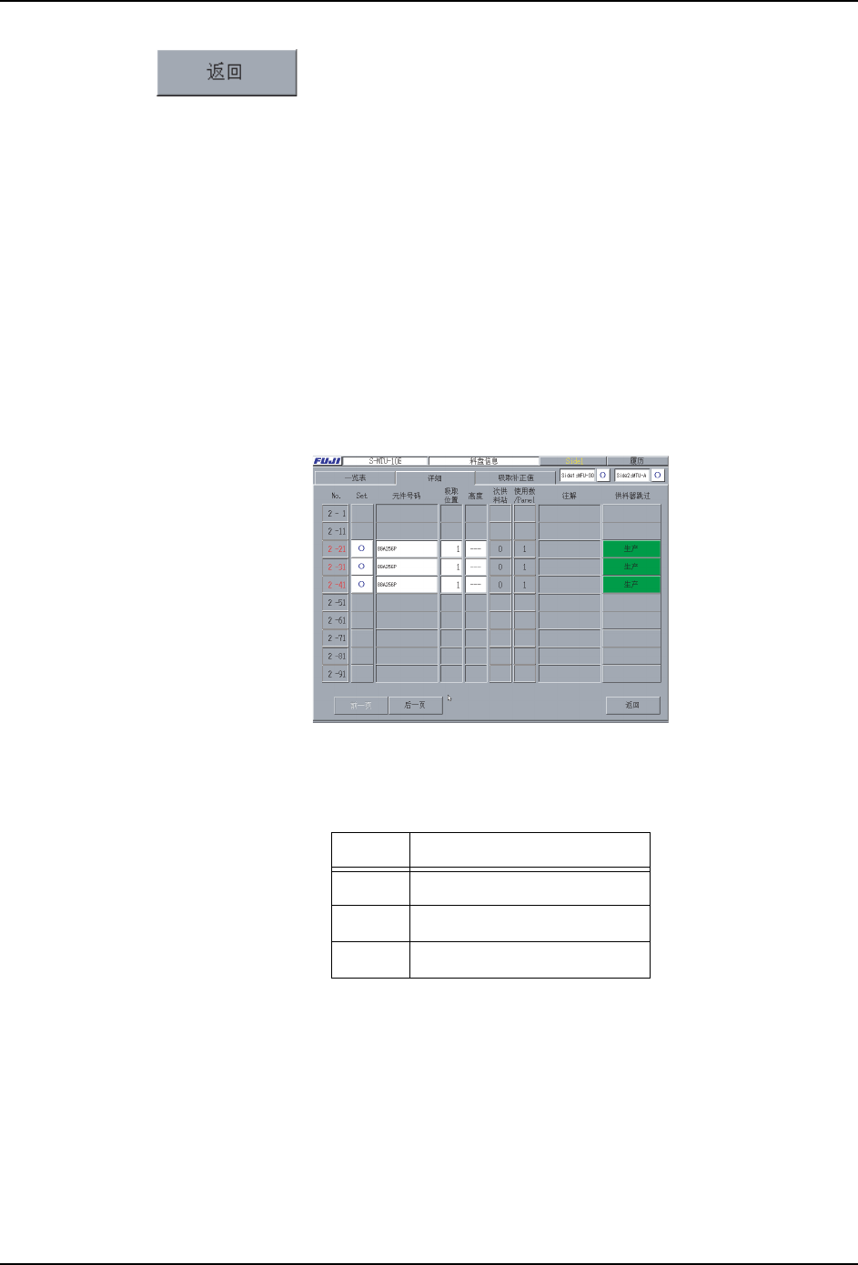 SYS-XPF-4.1S 3. 指令功能说明 XPF 系统手册 49 Next Slo t: 表示次料站。没有次料站的情况显 示为 「0」 。 使用数 /Panel: 表示 1 块电路板使用的元件数。 指令 : 表示安装供料器的指令。指令比较 长的时候,会显示出弹出视窗。 供 料 器 跳 过: 表 示 在 生 产 时 是 否 吸 取 元 件 的 状 态 。 只 有 在 [生 产]和[机 器 上 跳 过 ] 时能变更设定。 [ 生产 ]:…