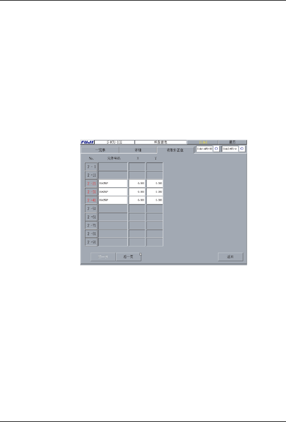 [ 料盘信息 ] 画面的吸取补正值,如下所示。