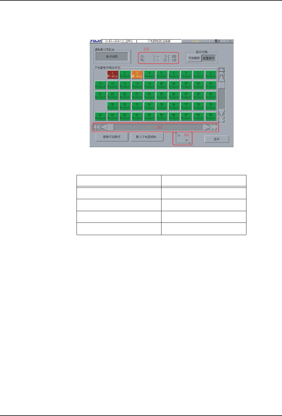 SYS-XPF-4.1S 3. 指令功能说明 XPF 系统手册 65 配置顺序表示时的 [ 子电路板号码以及状态 ] 显示栏内的按键 的显示与语言无关是英语的略 记。对应表如下所示。 3. 在读取跳过定位点中设定是否执行读取 。 [3] 坐标轴 5. 完成必要的编辑后,选择 [ 关闭 ] 以保存设定。 配置顺序表示时的坐标轴。 表示编号顺序 表示配置顺序 生产 Product 机上跳过 MC skip 程序跳过 PG skip 定位点跳…