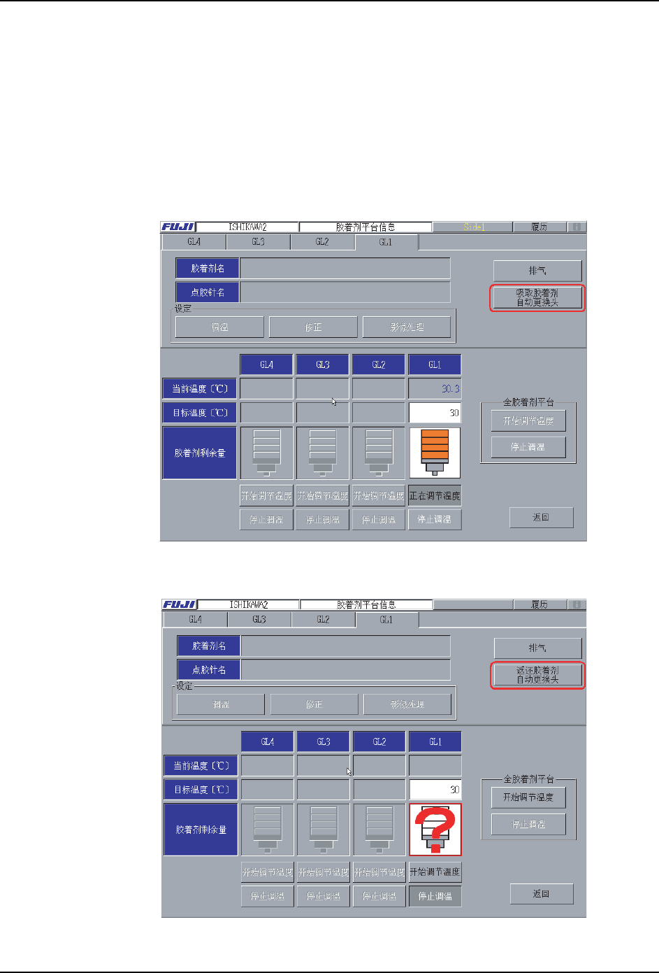 2. 按下 [ 返还胶着剂自动更换头 ] 按键返还胶着剂自动更换头到胶着剂平台。