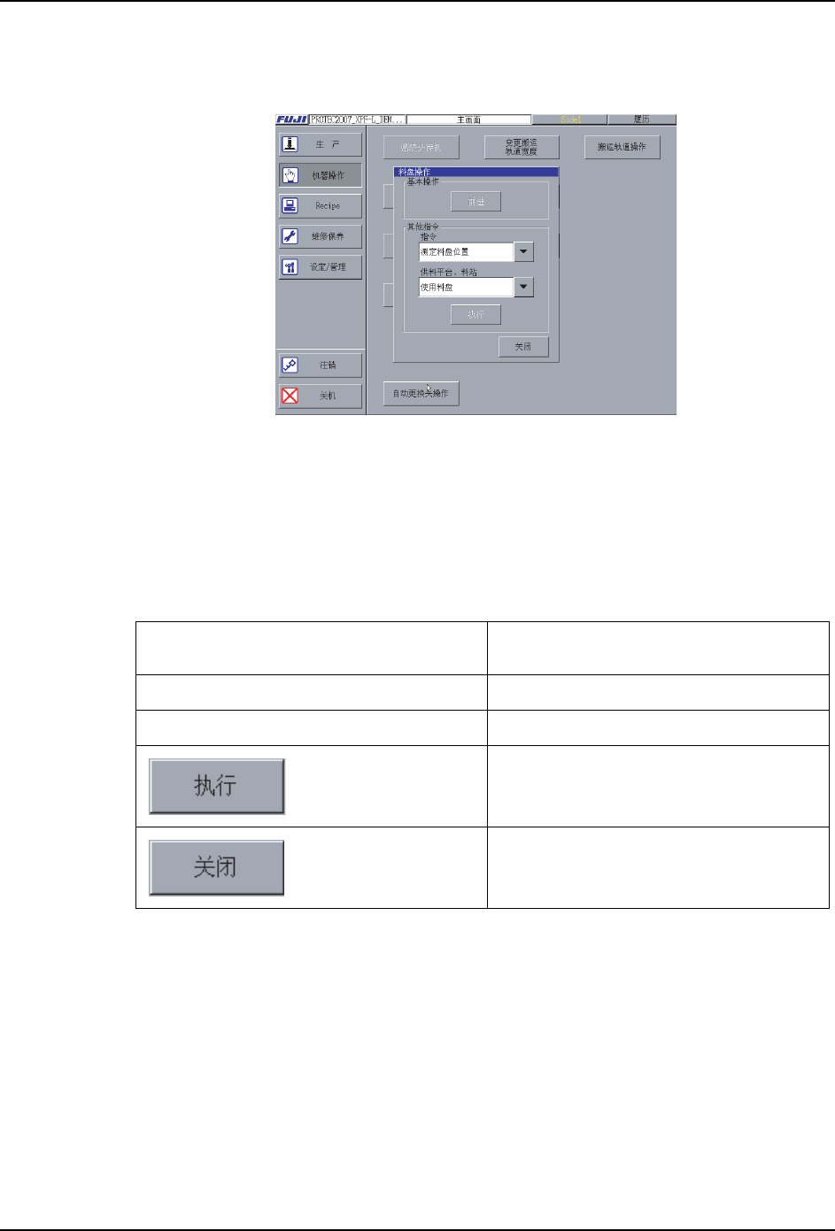 SYS-XPF-4.1S 3. 指令功能说明 XPF 系统手册 75 3.2.4 [ 机器操作 ] - [ 料盘操作 ] 功能说明 备注 ) 画面是使 BTU 夹紧的时候。 进行料盘元件的更换和供应时候 操作料盘。 表示步骤 从 [主画面]上顺序选择 [ 机器操作 ]、[ 料盘操作 ]。 画面说明 解说 料盘操作、 料盘元件的更换和进行供应的时候 使用。 料盘在使用 BTU 或者 MTU, ITS, OTS 时 供应。BTU、MT U …