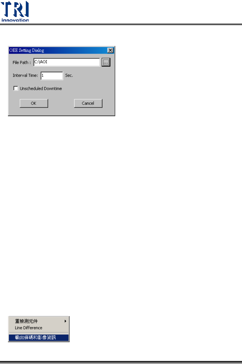 Test Research Inc. TR 7700 S II DL Us er Gui de – Software 91 1. 設定: Fil e Pat h :設定 status.log 的產生路徑。 Interval Time :設定產生檔案的間隔時間。 Unschedule d Downtim e :機台如在維護時,請勾此選項 , 維護後請取消。 輸出狀態 UD Unsche duled Do wntime 220 0 :機器故…